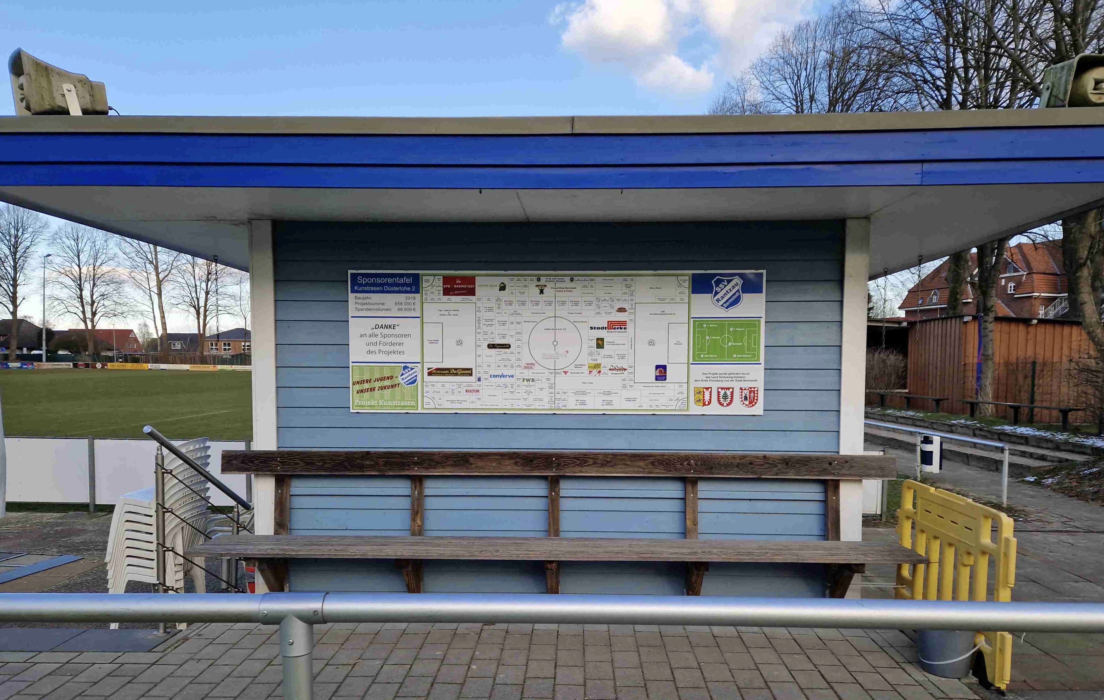 Was 2016 mit einer außerordentlichen Mitgliederversammlung auf der Düsterlohe begann, konnte nun auch optisch endgültig zu Ende gebracht werden. Jugendleiter und Mitorganisator der „Platzbauer“ Thomas Grzymek hat mit der geschichtsträchtigen Ballerbude einen geeigneten Ort für die Sponsorentafel gefunden.