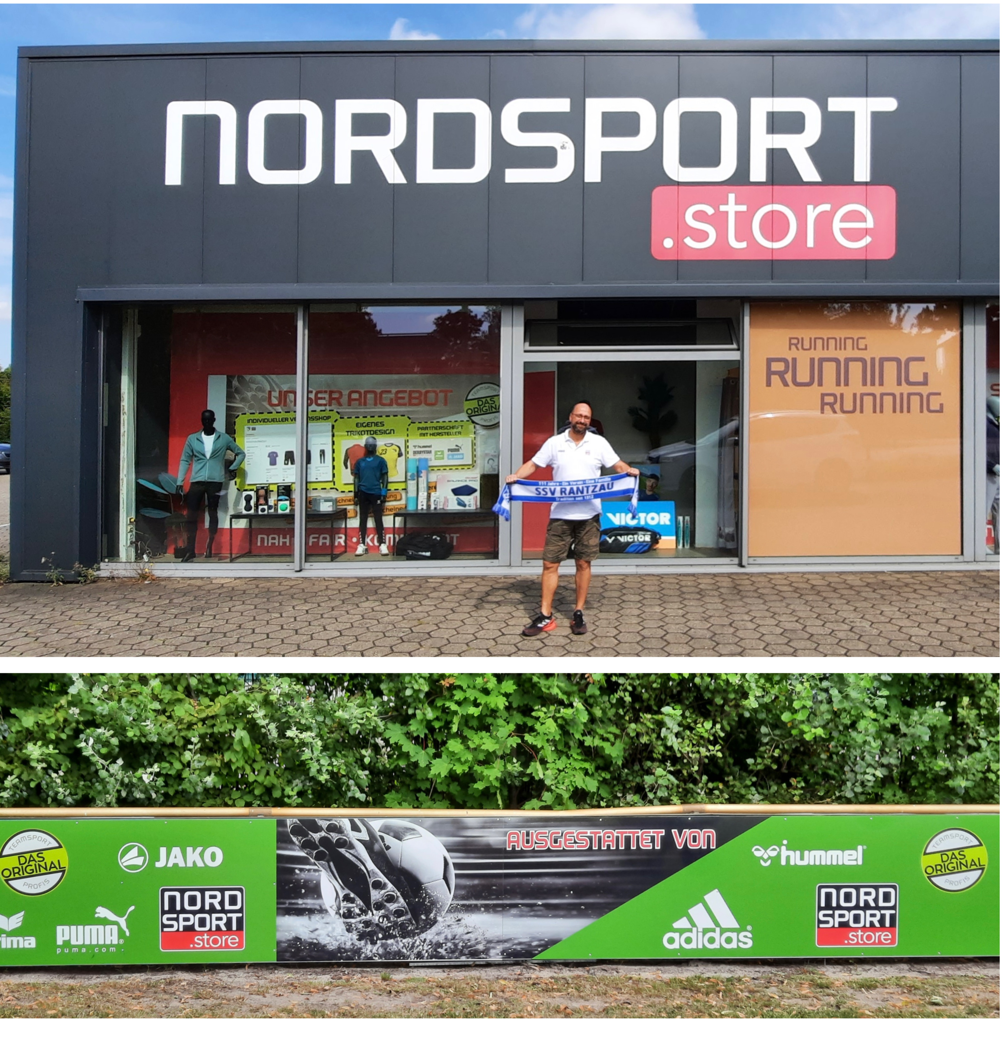 Die Basis der Firma Nordsport bildete schon damals der Teamgedanke durch den Vereinssport, der nach wie vor von der Belegschaft gelebt wird. Als Team haben sie über die Jahre ein großes Netzwerk geschaffen, dessen Kernkompetenz in der individuellen Sportausstattung von Vereinen besteht. Der Fokus liegt dabei auf Sportarten wie Fußball, Handball, Badminton und Tennis. Von der Mannschafts- und Trainingsausrüstung bis hin zur individuellen Sportausstattung. Jan-Ole Themm & André Pischel aus der Abteilung Teamsport stehen dem SSV Rantzau als kompetente Ansprechpartner zur Verfügung. NORDSPORT.store und der SSV Rantzau weiten die Zusammenarbeit und Kooperation weiter aus. Neben der Stadionzeitung „Düsterloher Geflüster“ bekommt der SSV Rantzau eine neue 6 m lange Bande auf dem Rasenplatz Düsterlohe 1. Durch die Bande wird die Anlage noch ein wenig schöner und aufgewertet.