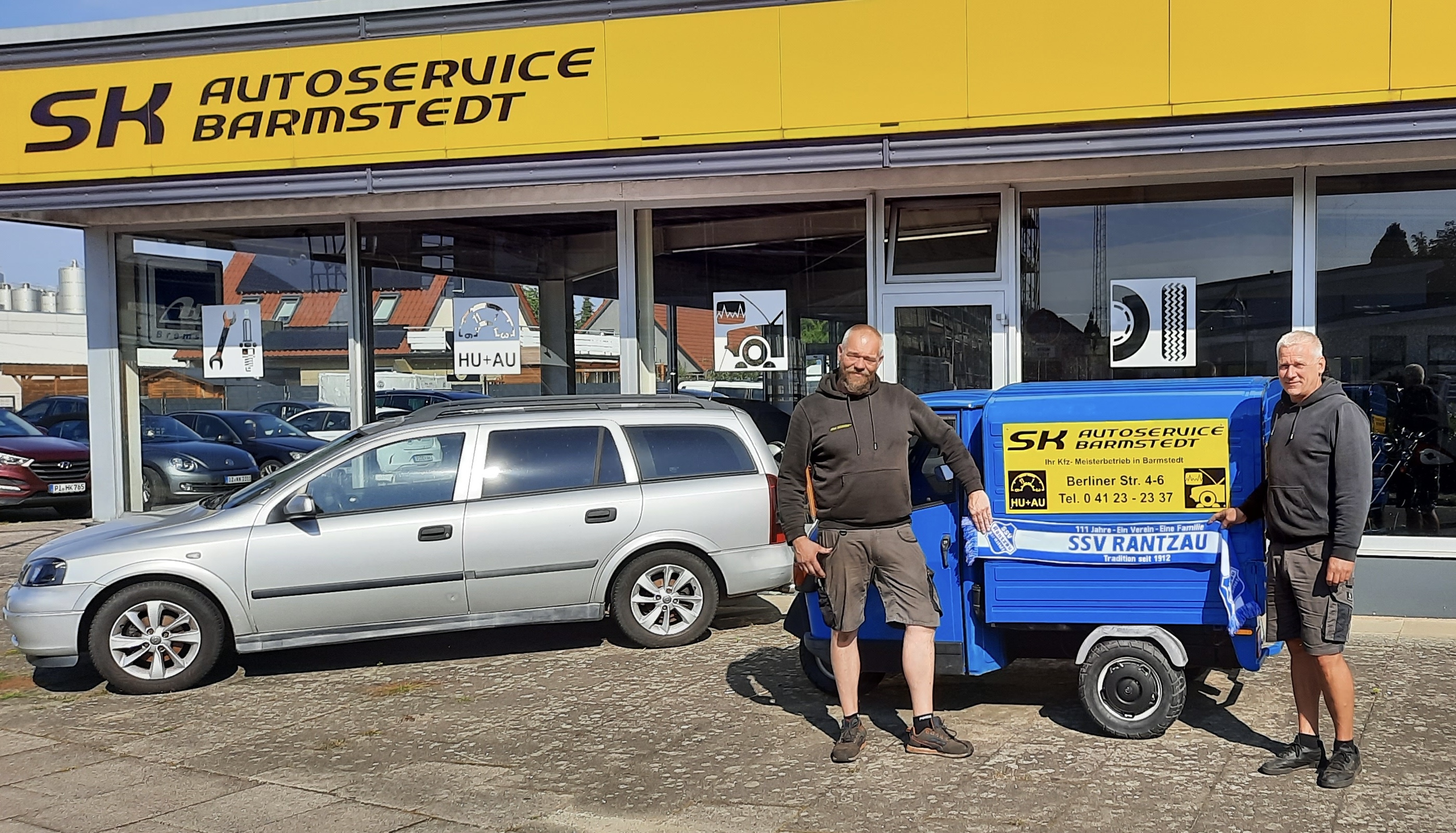Die Firma SK Autoservice Barmstedt ist langjähriger Förderer des SSV Rantzau und das Sponsoring-Team hat dies zum Anlass genommen, einen spontanen Besuch abzustatten. Stephan Slomianka und Sven Knutzen als Gesellschafter bieten einen kompletten Service rund ums Auto von der Achsvermessung bis zum Unfallservice und der TÜV-Abnahme. Beide haben vorher bei Firma Opel Genditzki am gleichen Standort in Barmstedt über viele Jahre gearbeitet und so war es einfach logisch, nachdem Manfred Genditzki in Ruhestand ging, die Firma unter dem neuen Namen SK Autoservice Barmstedt zu übernehmen. Stephan`s fussballerische Karriere beim TuS Hemdingen wurde leider schon früh durch eine Knieverletzung beendet. Der Bezug zum SSV Rantzau kam dann durch Tochter Eva, die es über den SSV bis in die 2te Liga bei Henstedt-Ulzburg geschafft hat. Mit der geschäftlichen Übernahme einher ging auch der Sponsoren Übergang. Eine schöne Bande ziert die Düsterlohe und lokal zu unterstützen ist für die beiden Ehrensache. Vor allem aber wird die tolle Jugendarbeit beim SSV Rantzau geschätzt und als eine der ganz großen Stärken hervorgehoben. "Leider fehlt mir oft die Zeit am Wochenende, Spiele auf der Düsterlohe anzuschauen" sagt Stephan ein wenig wehmütig. Als Trost haben wir 2 Dauerkarten hinterlegt. Vielleicht sieht man den einen oder anderen wieder etwas häufiger als Zuschauer unserer 1ten Herren.