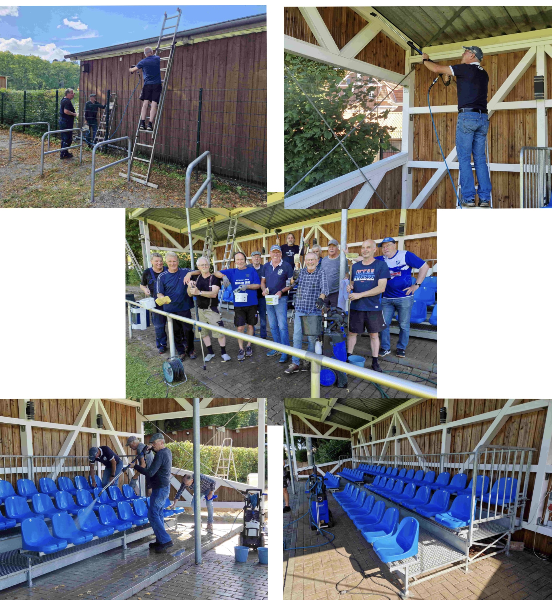 Sie waren mal wieder aktiv, die SSV - Superoldies. 2020 von ihnen nahezu im Alleingang gebaut, war fünf Jahre später eine Generalreinigung der Sitztribüne auf der Düsterlohe fällig. Und dank Hochdruckreiniger und Einsatz des gut ausgerüsteten kompletten Teams glänzte sie bereits nach Stunden wieder wie neu. Und als Selbstbelohnung gab´s anschließend neben einem kleinen Bierchen leckere Würstchen vom Grill. Also, wer Lust hat auf Fußball und Geselligkeit hat, sollte sich mal sehen lassen: Training immer mittwochs 18.30 Uhr auf dem Kunstrasen der Düsterlohe.