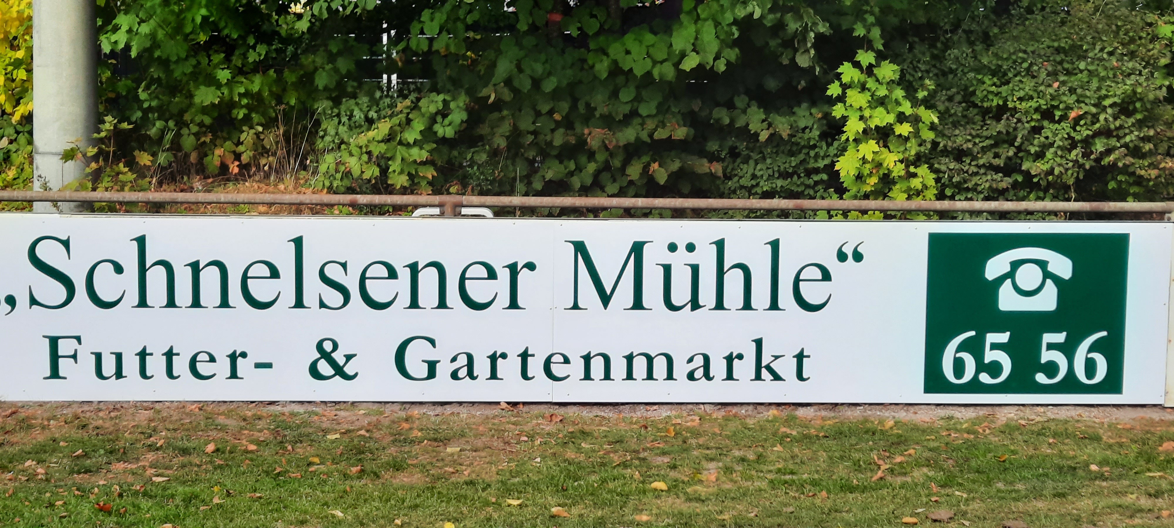 Als einer der Geschäftsführer der Schnelsener Mühle hatte Peter nun die Idee, die wirklich schon in die Jahre gekommene Werbebande durch eine neue zu ersetzen.