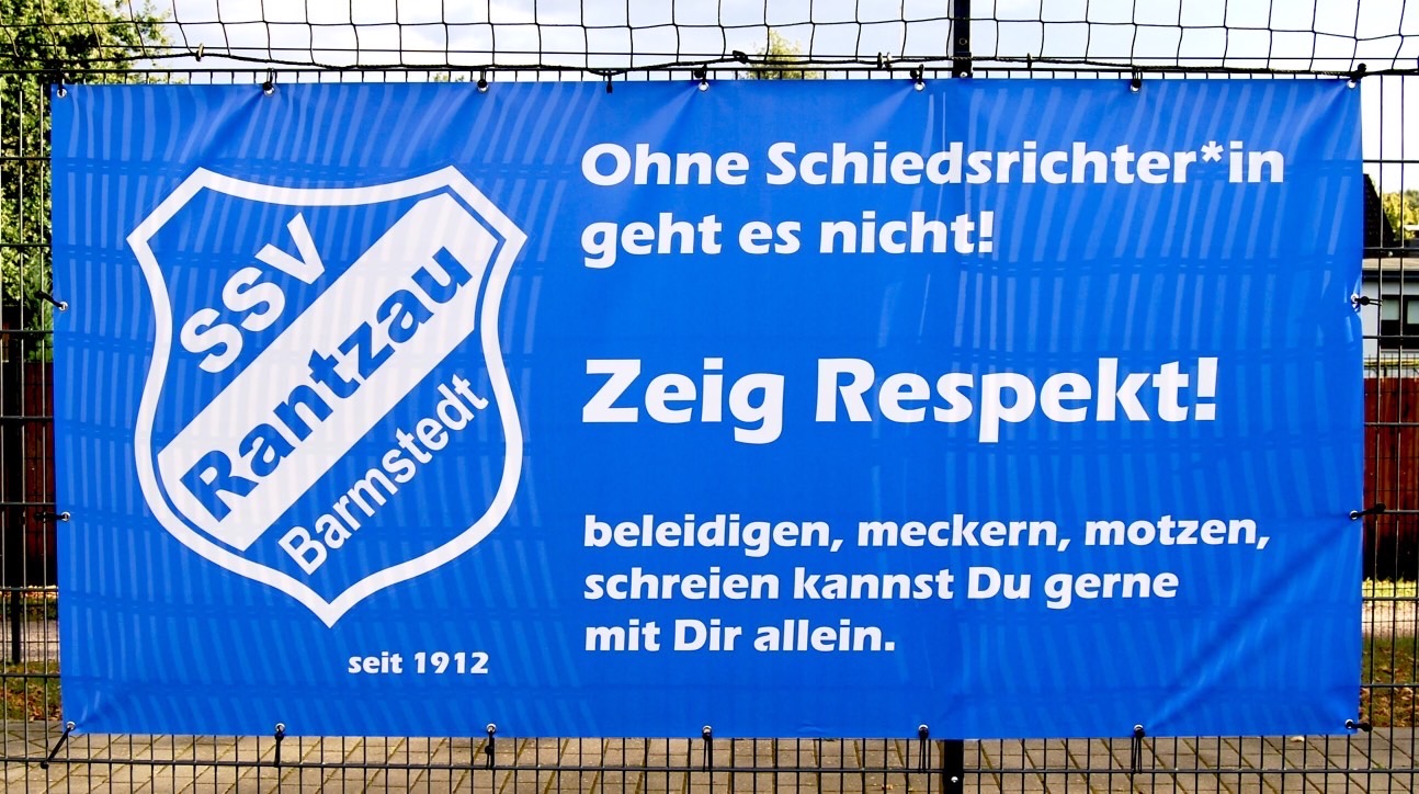 Wir bedanken uns herzlich bei Matthias Grütz von der Kulturschusterei für die Spende und die tolle Idee, dieses Thema sichtbar zu machen. Mit den beiden Bannern setzen wir gemeinsam ein deutliches Zeichen: Respekt gegenüber den Unparteiischen gehört genauso zum Fußball wie Teamgeist, Einsatz und Leidenschaft.