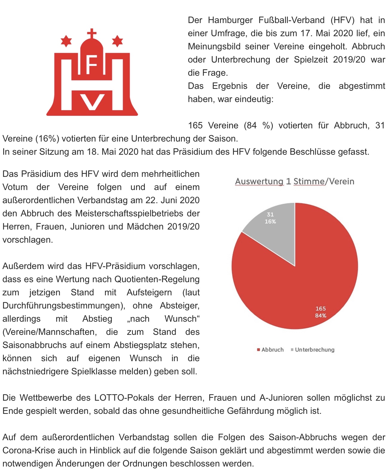 Spielbetrieb aktuell: Vereine des HFV mehrheitlich für Abbruch der Saison Vereine des HFV mehrheitlich für Abbruch der Saison Außerordentlicher Verbandstag des HFV am 22. Juni 2020 Quelle HFV
