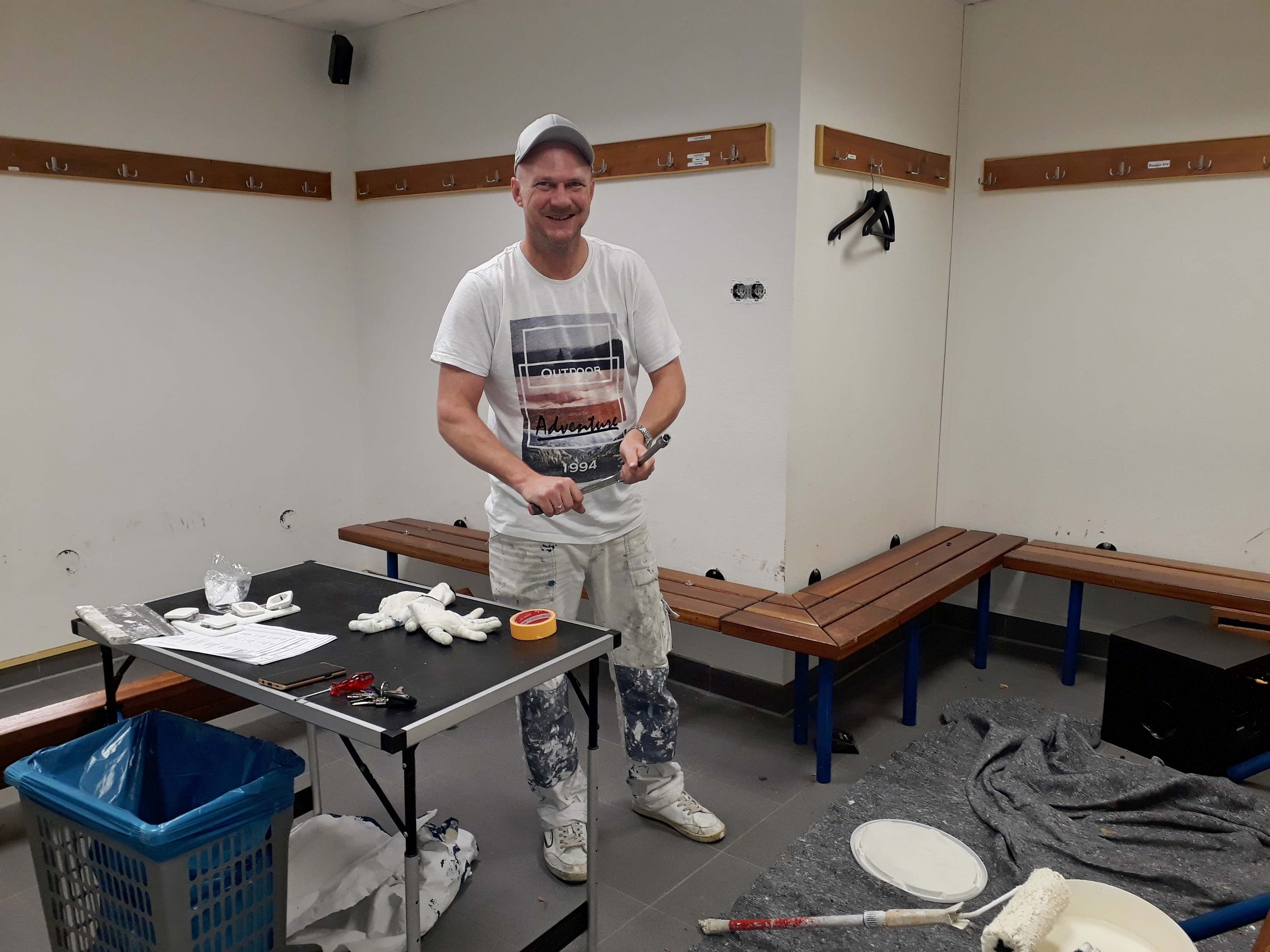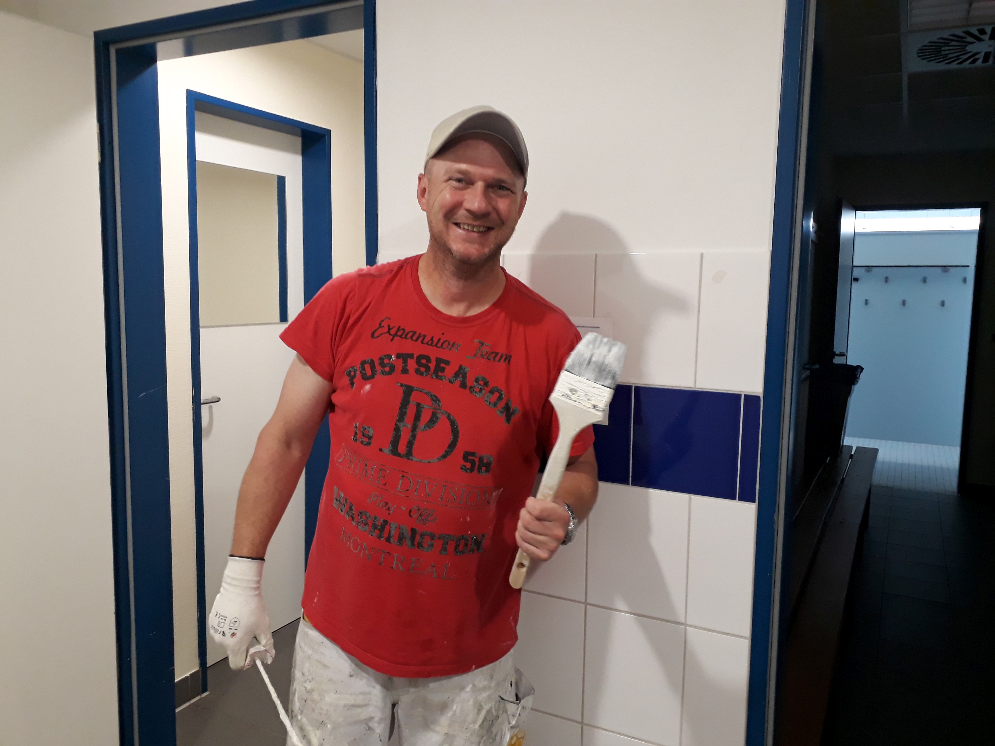 Malermeister Mirco Lefoldt bringt im Auftrag von Vorstandsmitglied und SSV-Förderer Dirk Michalski praktisch die gesamte untere Etage samt Umkleidekabinen und Konferenzraum auf Hochglanz.