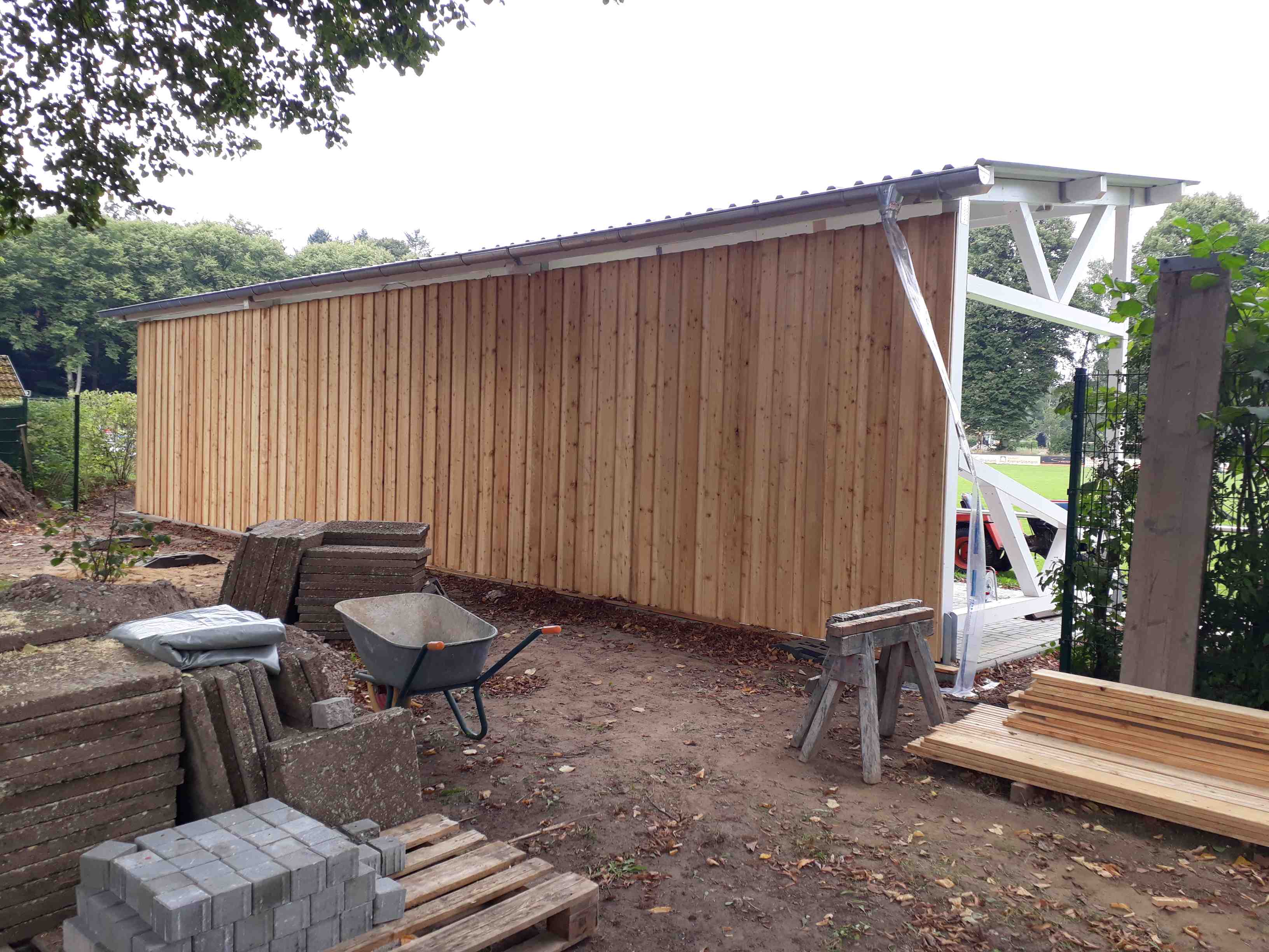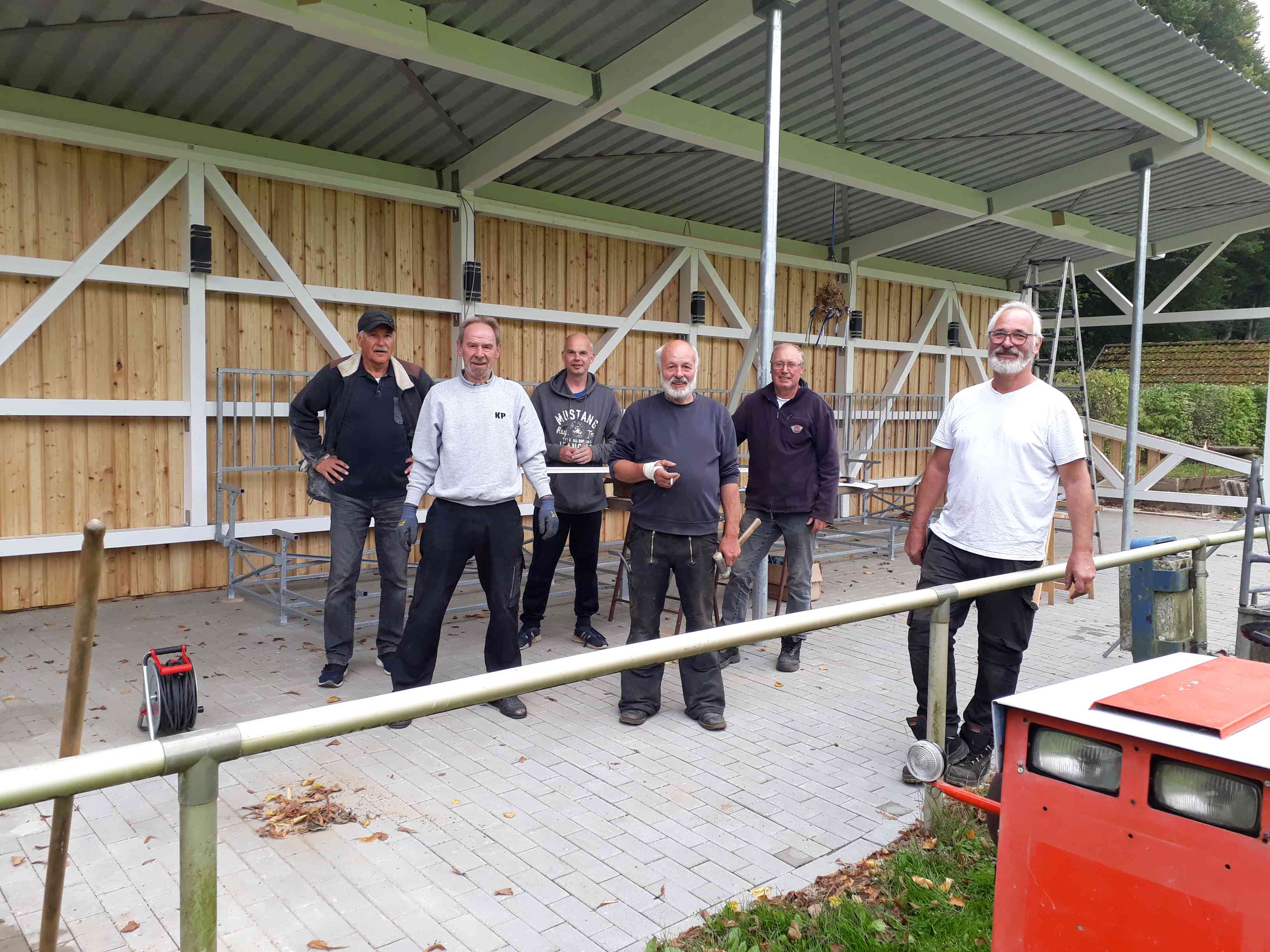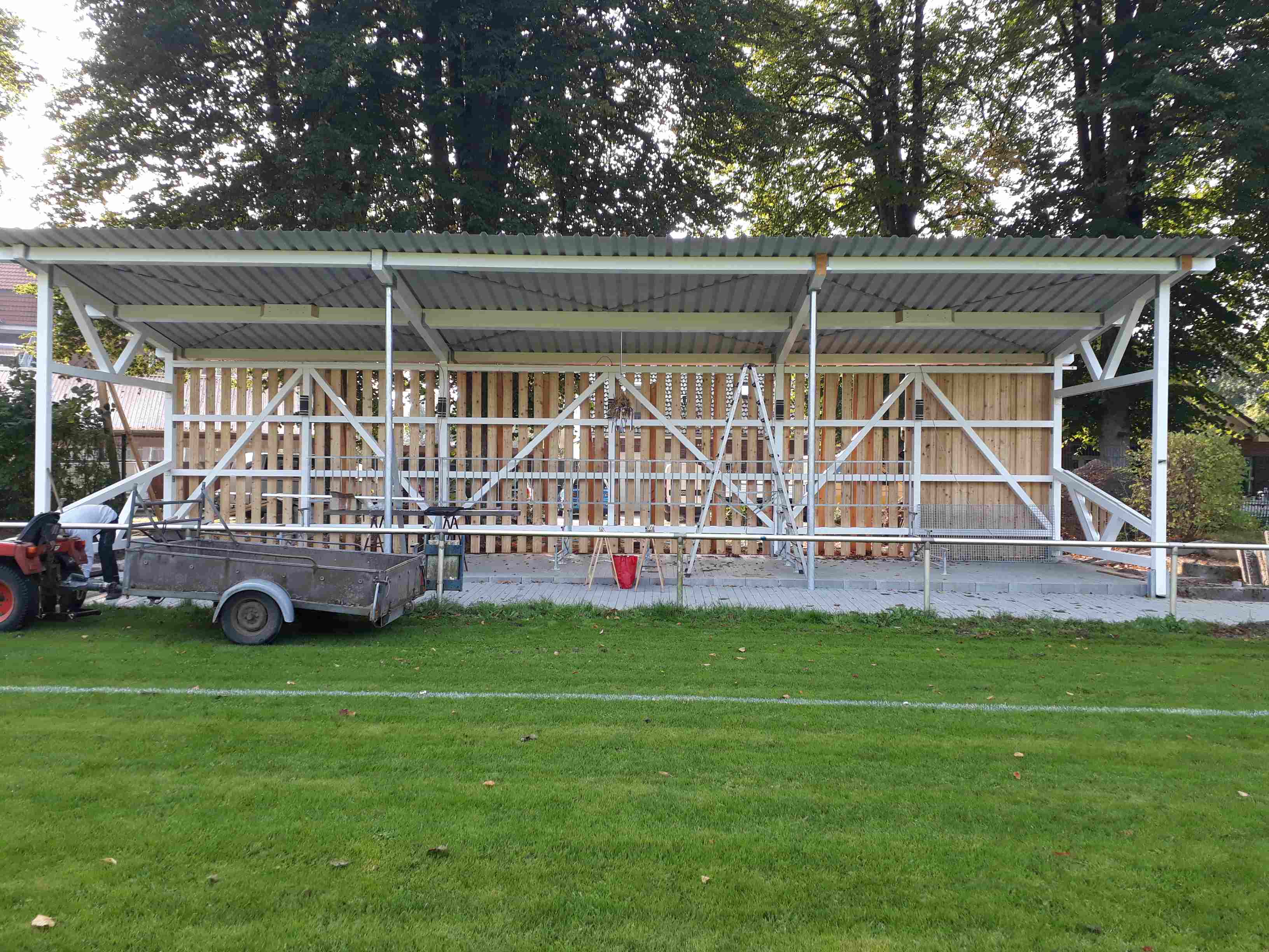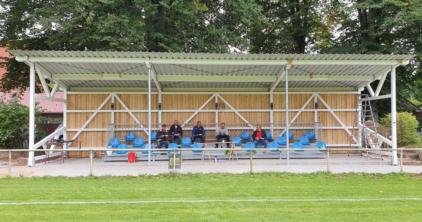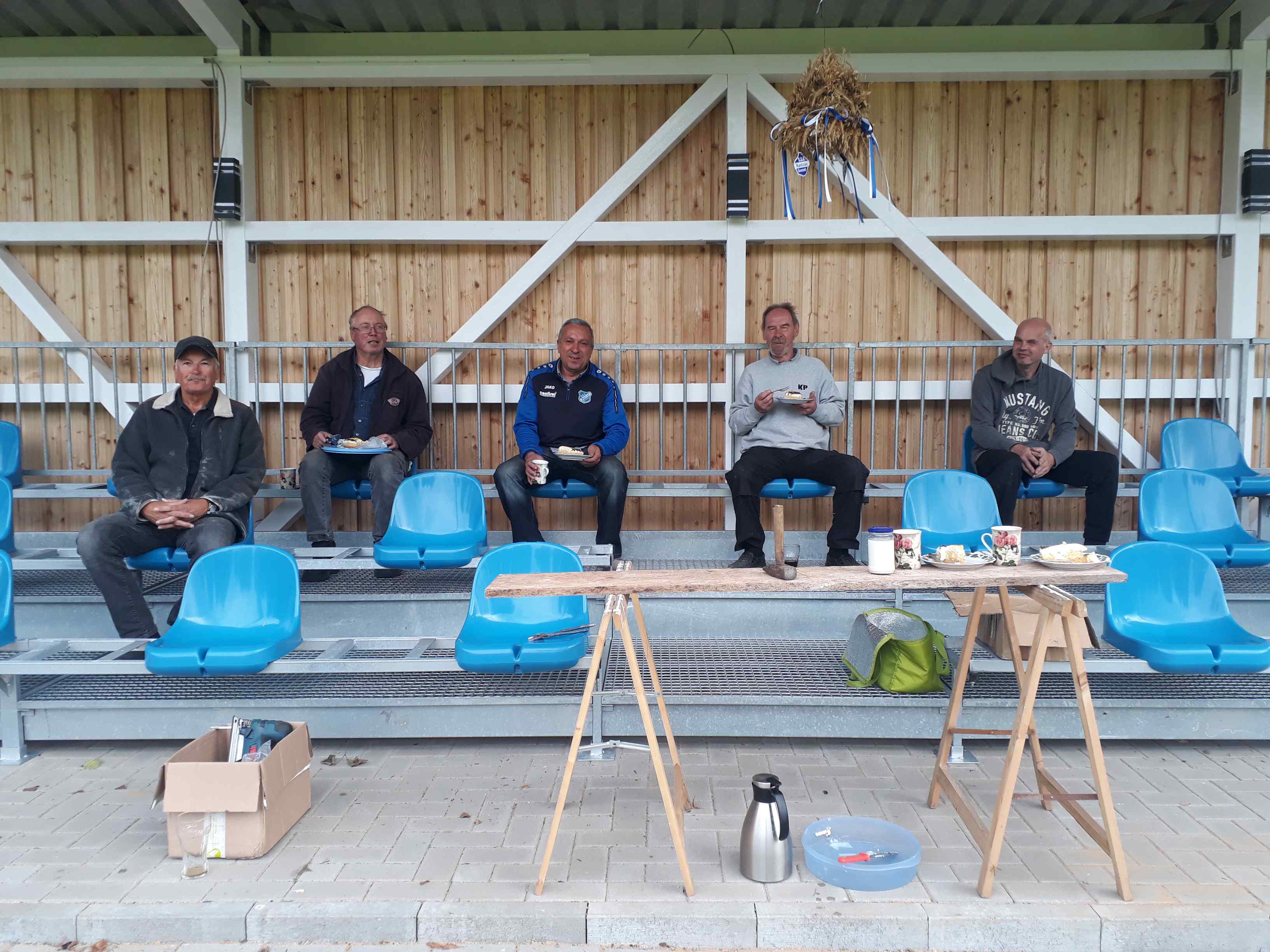 In einem rasanten Endspurt am Wochenende legten sich Zimmerer Hinnerk Will & Team zusammen mit den Rantzauer Hobbyhandwerkern noch einmal total ins Zeug, um die "Baustelle" in eine nahezu abnahmereife Sitztribüne umzuwandeln. Nach Schließen der Rückwand und Montage der Sitzschalen verbleiben im Wesentlichen "nur" noch Sisyphusarbeiten, wie das Verkleiden der Seitenwände, Elektroarbeiten etc., um den Unterstand absolut komfortabel zu machen. Vorausschauend wurden die Sitzschalen unter Corona-Bedingungen montiert, d. h. die Sitzplätze wurden zunächst auf die im Moment zulässige Anzahl begrenzt. Das tut dem Ganzen aber überhaupt keinen Abbruch: Der SSV ist überaus glücklich mit dem Erreichten und präsentiert das Sportgelände Düsterlohe in einem vorbildlichen, vorzeigefähigen Zustand. Vor diesem erfreulichen Hintergrund genossen die SSV-"Bauhandwerker" denn auch schon mal den verdienten Kaffee und Kuchen zum Feierabend, wie auf den Fotos ersichtlich.