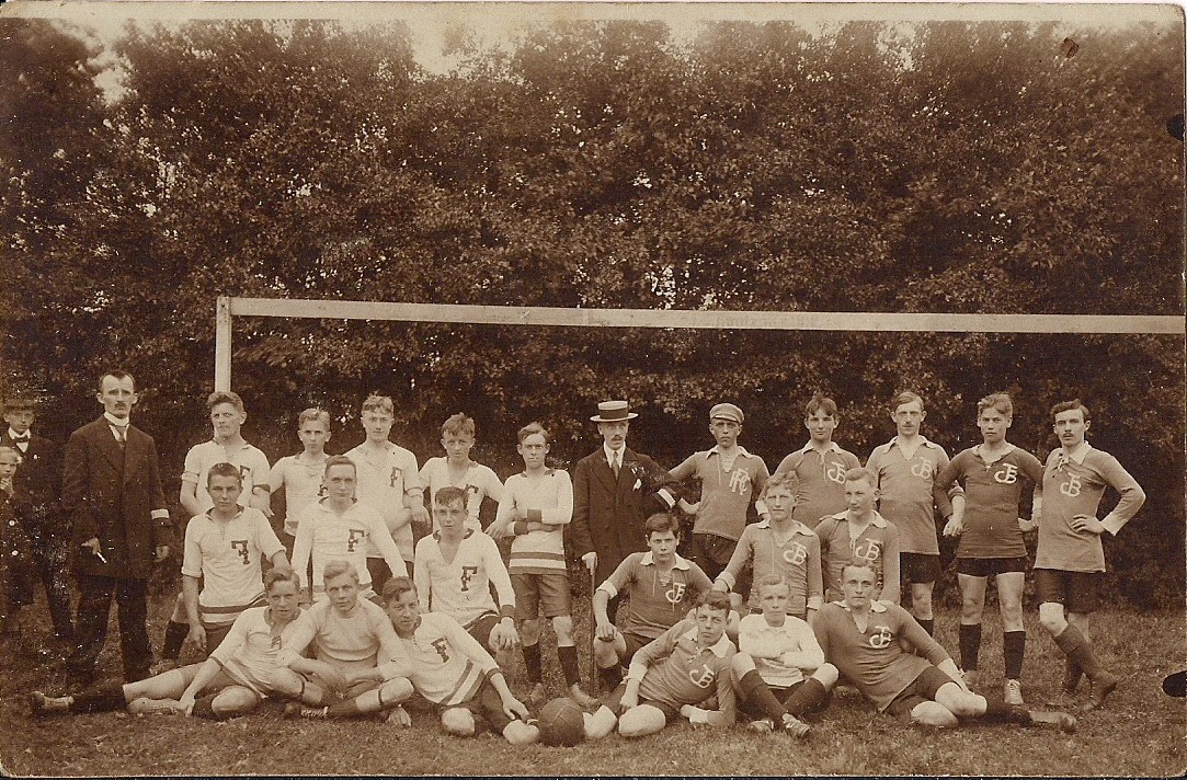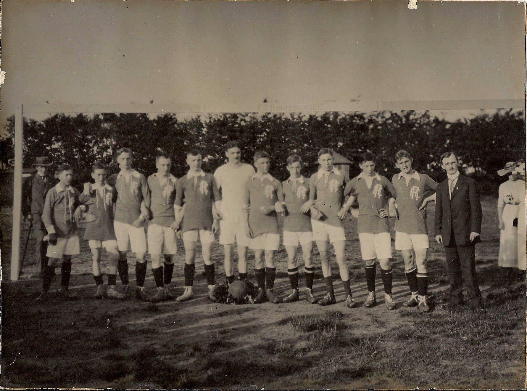 1913 Ligamannschaftsfoto des FC Rantzau auf der Düsterlohe. Links auf der Brust die Buchstaben "FCR" (FC Rantzau) von links: Heinr. Lauke, H. Weitendorf, Helmut Saß, Max Puter, W. Rachow, R. Butenschön, W. Rehrbehn, Chr. Haack, Paul Gediger, A. Möller, Johs. Vossbeck sowie der 1. Vorsitzende Heinrich Kaeckerey (Vereinsmitbegründer und späteres Ehrenmitglied)