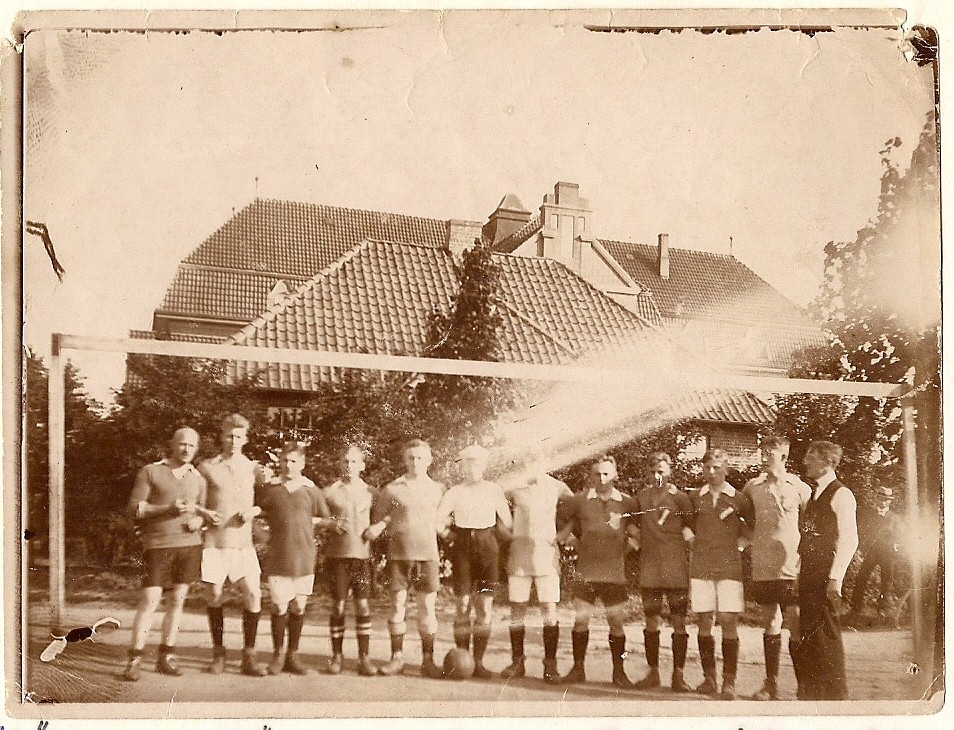 1916 FC Rantzau auf der östlichen Seite des Sportplatzes Düsterlohe (im Hintergrund das 1916 eingeweihte Krankenhaus der Grafschaft Rantzau / heute Jugendbildungsstätte) Die hinter dem Tor sichtbaren Linden rahmen auch heute noch die "Hannes-Vollstedt-Allee" (benannt nach unserem früheren Platzwart und “SSV-Original”)) von links: Hans Kühl, Erich Kühl, Lauke, Thies, Ernst Biesterfeldt (Vereinsmitbegründer und späteres Ehrenmitglied), Prange, Markmann, Abel, Pieper, Rathsach, Schmuck, Schiedsrichter Möller
