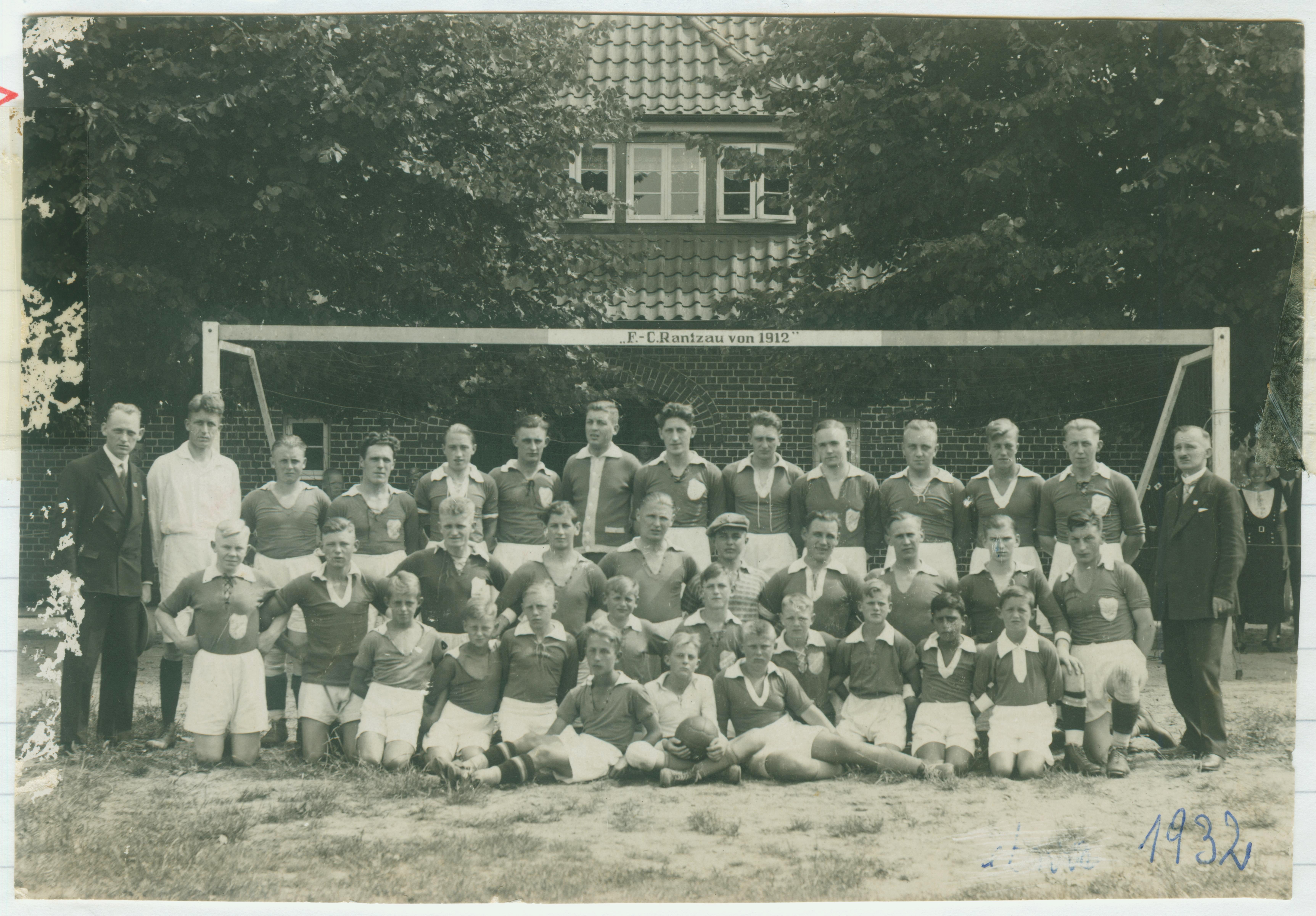 1932 Pfingsten F.C. Rantzau vor dem Sporthaus Düsterlohe. Die auch noch heute dort stehenden Linden stehen in vollem Laub. 1. Herren hintere Reihe: von li. W. Hartz, E. Kühl, F. Schimanski, H. Bornholdt, H. Thee, E. Heidorn, H. Behrmann, H. Schmuck, H. Pump, H. Krüger, W. Wrage, W. Herrmann, Joh. Schmuck (Vater von Günter Schmuck), H. Kaeckerey, Reserve mittlere Reihe: H. Beste, G. Biehl, W. Pump (Kaiser), E. Behrmann, W. Neufeind, A. Birn (ehem. Wirt v. Waldschlösschen), H. Hauschildt, Saß, W. Griebel, H. Böge Schüler vordere Reihen: B. Günther, Mußler, Tietjen, Habermann, Brodzina, O. Eggert, W. Böge, Touba, Franke, Hermann Mohr, W. Runge, W. Fischer