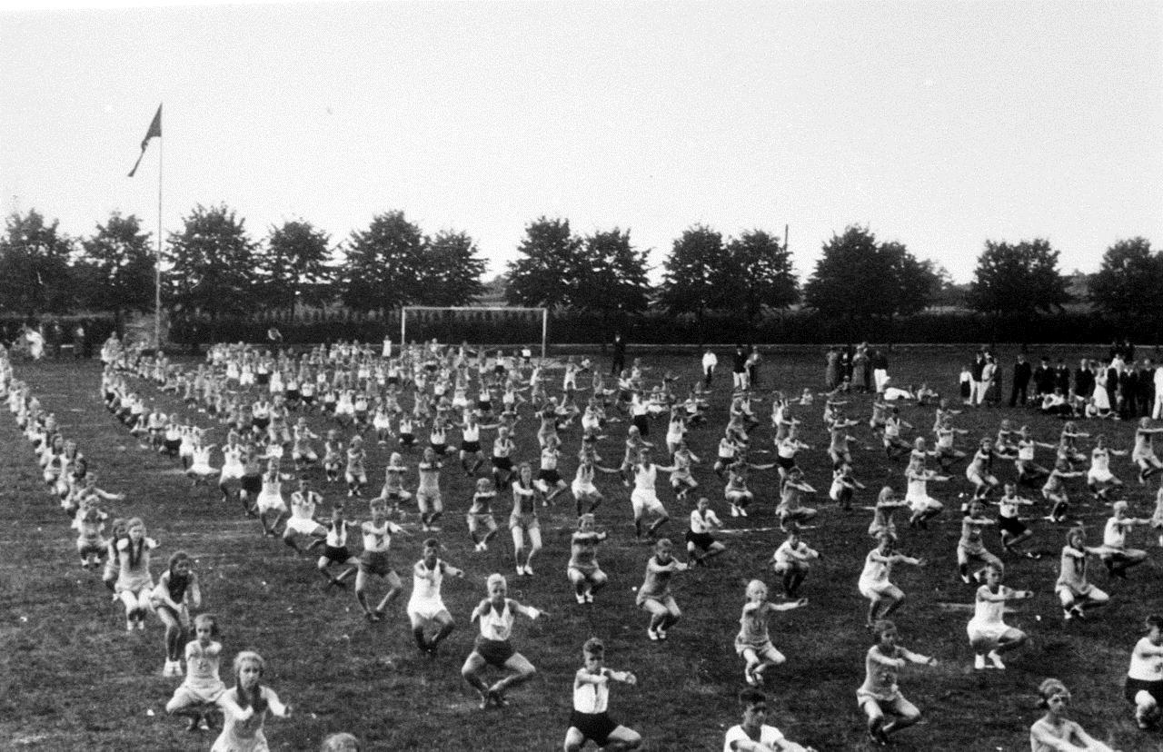 1934 Kinderturnfest auf der Düsterlohe (damals noch nach dem Turnvater Jahn Jahnwiese genannt). Im Hintergrund das heutige Baugebiet (neue KIndertagesstätte)
