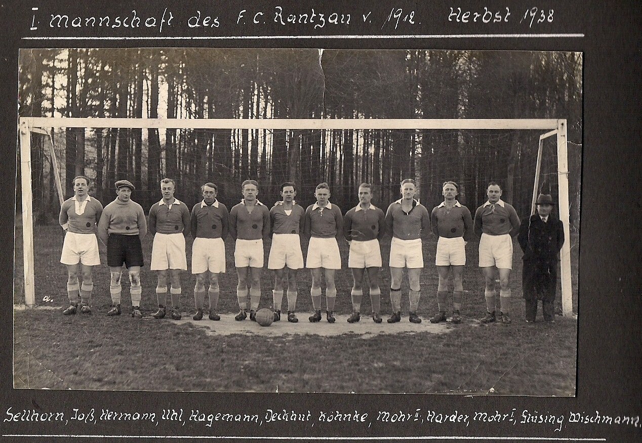 1938 Die 1. Herren des F.C. Rantzau Zweiter von rechts der spätere Ehrenvorsitzende Wilhelm Glüsing. Nach dem Start seiner aktiven Fußballzeit in den 1920er Jahren übernahm er die Aufgabe des Vereinsvorsitzenden bereits unmittelbar nach dem Krieg 1945 - 1947 und ein zweites Mal für mehr als zwei Jahrzehnte 1954 - 1976. Zudem war er Ehrenvorsitzender des Kreissportverbands. Übrigens, während der Zeit des Nationalsozialismus wurden Sportvereine nicht von Vorsitzenden geleitet sondern von Vereinsführern (Anweisung der Reichsregierung