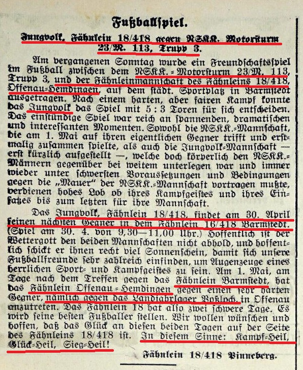 25. April 1939 Bericht der Barmstedter Zeitung Und auch das erlebte das städtische Sportgelände an der Düsterlohe: Fußballkämpfe des Jungvolks, wie damals die Jugendorganisation der Hitlerjugend (10 - 14 Jahre) genannt wurde. Es gab z. B. Kämpfe der Fähnlein (Teileinheiten des Jungvolks) Barmstedt, Offenenau-Hemdingen und Landjahrlager Voßloch. Und der fanatische Siegesgruß durfte nicht fehlen.