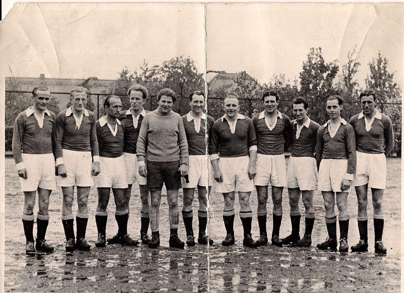 1951 Liga nach Schlammschlacht in Langenhorn Von links: Harry Koch, H. Schulz, Hermann Mohr, Werner Böck, Torwart Heinz Gumpert, Otto Fuge, Hänsel Andresen, Werner Kasprick, Heinz Fuge, Kurt Herrmann, Hannes Habermann
