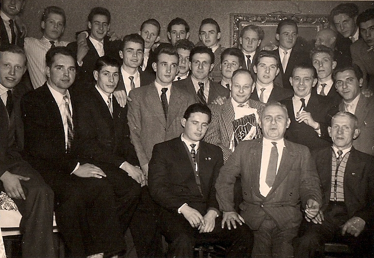 1953 eine der damaligen vielen Feiern im Waldschlösschen Hintere Reihe stehend, von links: 1. verdeckt ??????, 2. weißes Hemd ??????, 3. Hermann Hinsch, 4. Horst „Sir“ Witt, 5. Heinz Gädgens, 6. Willi Runge, 7. Hans Mattick, 8. Hans-Werner Kühl „Kühle“, 9. ?????? 10. Günther Fick, 11. verdeckt ?????? Mittlere Reihe: 12. (?) Poldi Ehlers, 13. Heinz Trojahn, 14. Kuddl Hinsch, 15. Horst Oltersdorf, 16. Horst Lewald, 17. Günther Schmuck (nur Kopf sichtbar), 18. Werner Kasprick, 19. ??????, 20. mit Wimpel Ehrenvorsitzender Willi Glüsing, 21. Arthur Fick, 22. Ligatrainer Rudi Eckl, 23. Klaus Timm, 24. Heinz Fick Sitzend vorn: 25. Bruno Sommerfeldt, 26. Helmut Thiel, 27. Willi Hinsch