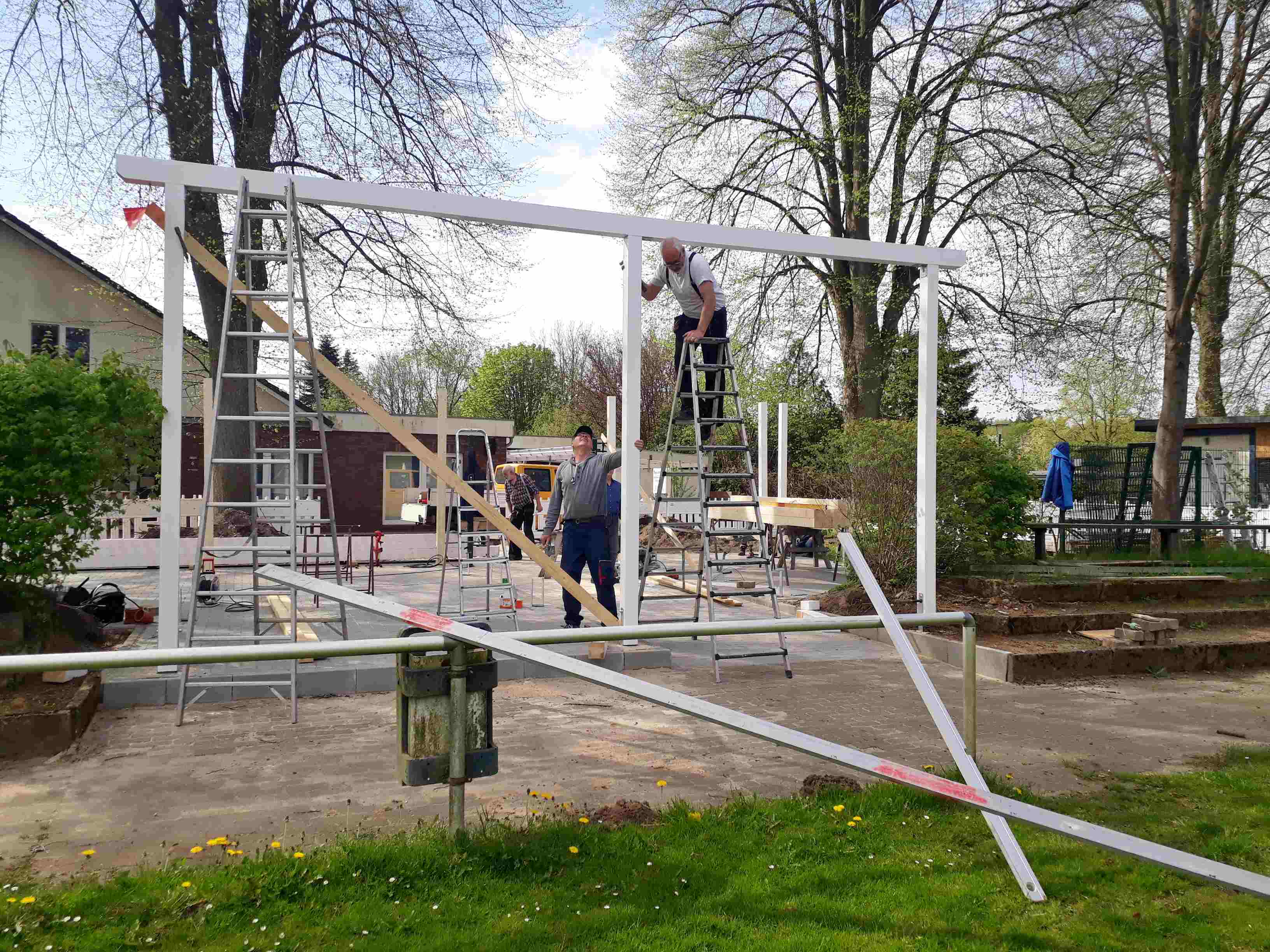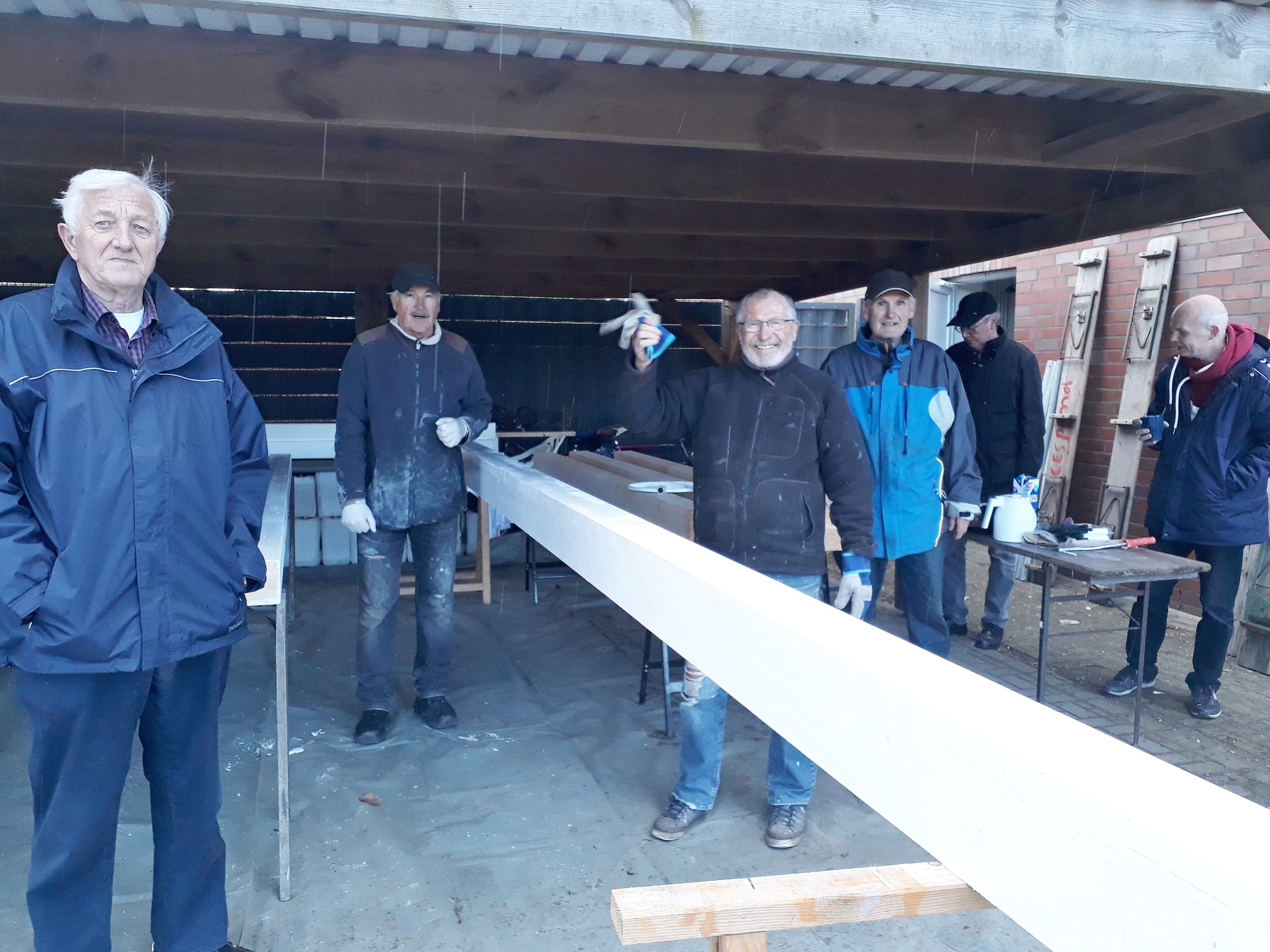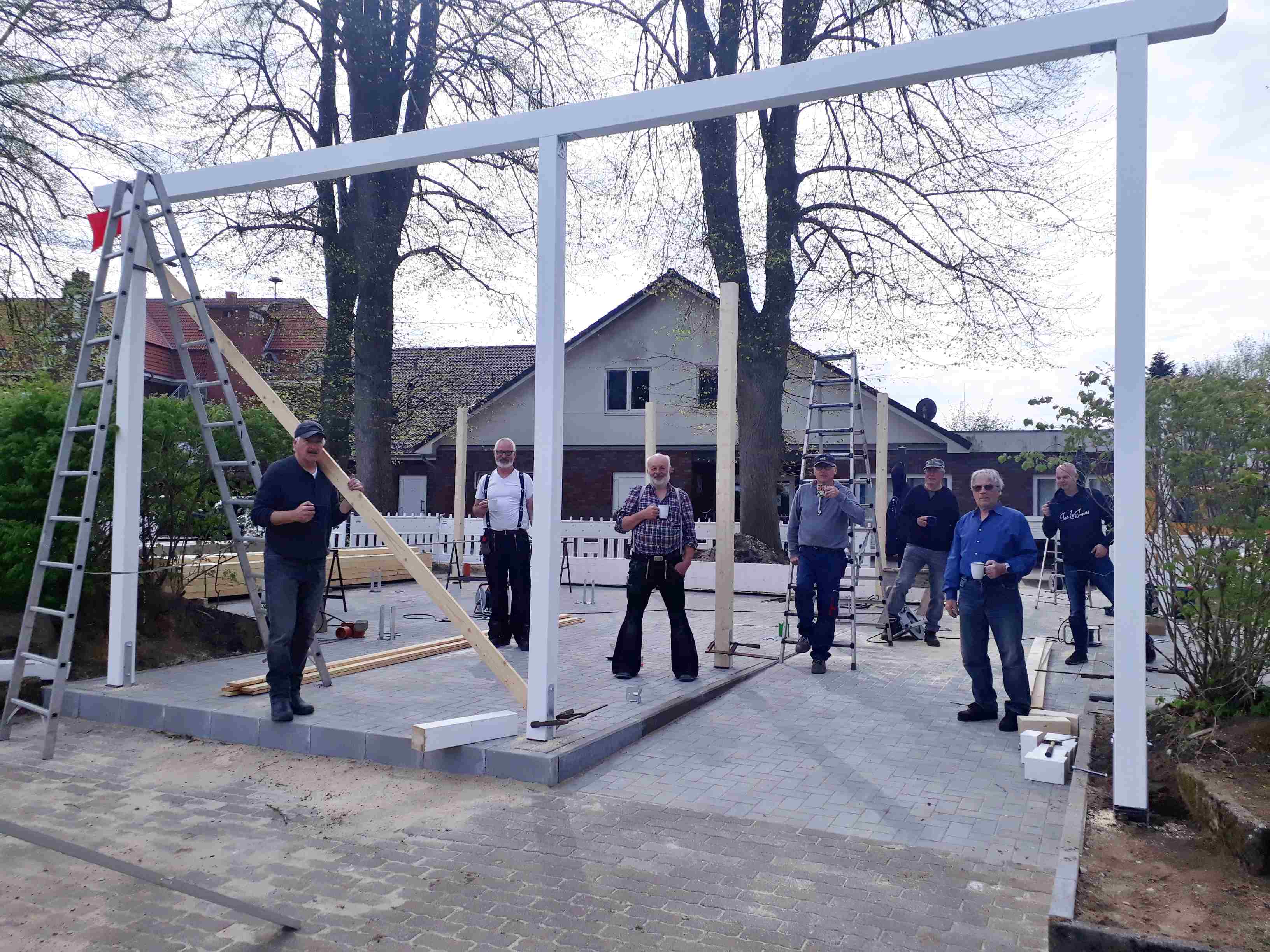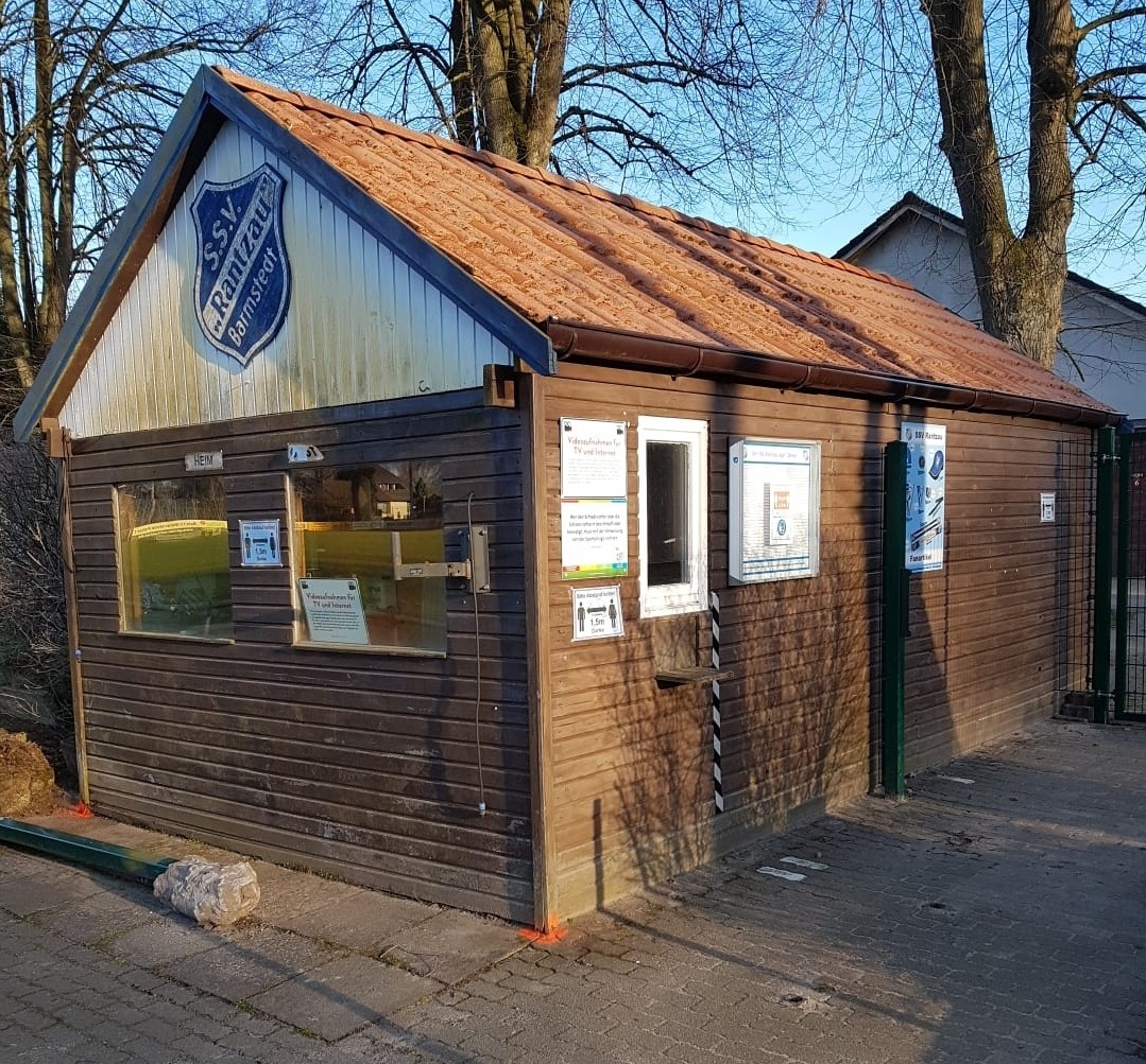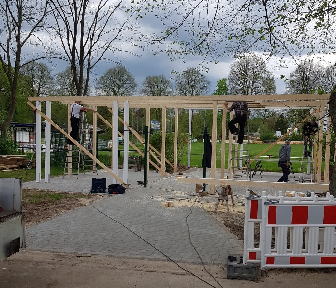 Allmählich nimmt das nagelneue Multifunktionsgebäude Form an und nicht nur die Planungsgruppe um Thomas Grzymek, Werner Raven und Hans-Jürgen Scharlach ist sich absolut sicher, dass der Eingangsbereich zum Spielfeld Düsterlohe 1 optisch gewinnen und zum unbestrittenen Hingucker wird. "Sehr repräsentativ .... ", war denn auch schon mehrfach zu hören. Und damit da aber auch überhaupt nichts schief gehen kann, hat sich der SSV auch diesmal wieder seine bewährten Zimmerer Hinnerk Will & Team für die Holzarbeiten gesichert. Übrigens, von Seiten des SSV sind wieder einmal fast ausschließlich die SSV Superoldies an der Realisierung beteiligt. Da kann sich der Traditionsverein von der Düsterlohe doch mehr als glücklich schätzen. Die Fotos zeigen die Situation noch vor wenigen Wochen (Foto 1) bis Ende des ersten Arbeitstages.