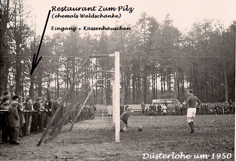 Aufnahme um 1950 Unmittelbar nach dem Ende des 2. Weltkriegs begann der reguläre Spielbetrieb wieder auf dem angestammten Rantzauer Spielfeld parallel zum Waldrand. Hier spielten 1946/47 z. B. Hannover 96, Fortuna Düsseldorf, Stadtauswahl Köln und der HSV. Kassenhäuschen und Zugang zum Platz (heute Kunstrasen) befanden sich gegenüber der heutigen Einfahrt zum Pilz.