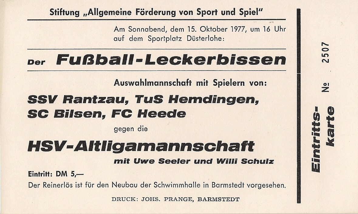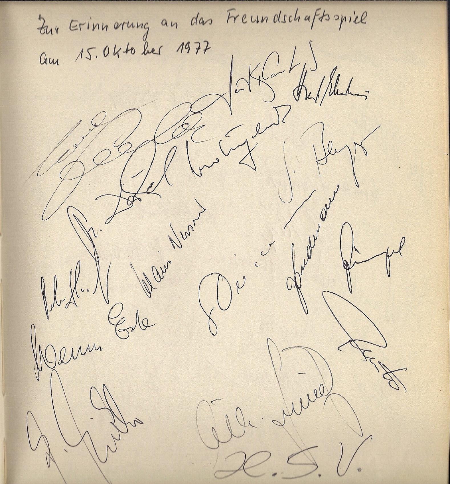 Unser SSV-Archiv macht`s möglich. Nicht nur weitere Fotos, sondern sogar ein Gästebuch mit Unterschriften von Uwe Seeler und seinen damaligen HSV-Mitspielern kann der SSV Rantzau stolz präsentieren. Selbst eine Eintrittskarte zum Besuch auf der Düsterlohe für 5,- Deutsche Mark ist noch vorhanden. Was damals eine Attraktion für Barmstedt und Umgebung war, gilt heute fast als historisch. Die Idee zu diesem Freundschaftstreffen gegen die HSV-Altliga war übrigens entstanden, als die Stiftung „Spiel und Sport“ nach Finanzierungsmöglichkeiten zum Neubau der Schwimmhalle im Jahre 1977 (heute Barmstedter Badewonne) am Rantzauer See suchte. Anmerkung: Die Unterschrift Uwe Seelers ist auf der Gästebuchseite ganz oben links zu entdecken.