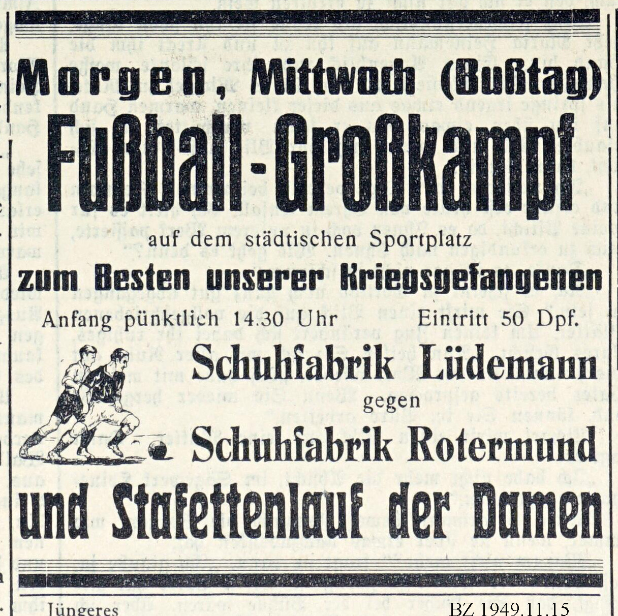 Ein weiteres Großereignis 1949 war ein Fußball-Großkampftag der damaligen Barmstedter Schuhfabriken Lüdemann und Rotermund „zum Besten unserer Kriegsgefangenen“. Sie mussten bekanntlich noch weitere sechs Jahre in Russland auf ihre Heimkehr nach Deutschland warten. Dazu gab es noch einen Stafettenlauf der Damen.
