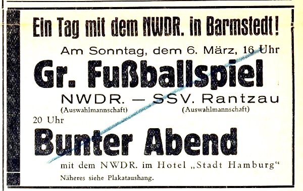 Und so war denn auch 1949 der „Nord-West-Deutsche Rundfunk“ (heute NDR) auf der Düsterlohe zu Gast, um sich publikumswirksam einer Auswahl des SSV zu stellen. Und abends traf man sich zu einem Bunten Abend im damaligen Hotel Stadt Hamburg Am Markt.