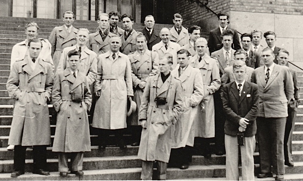 1952 Die SSV Jungliga in Stockholm. Auf dem Foto abgebildete Rantzauer: Kurt Kallies, Hannes Matthei, B. Hansen, Hans- Werner Kühl, Hartz, Franz Grisard, Heinz Frieske, Trainer Helmut Thiel, Wolfgang Möller, Peter Biesterfeldt, Kurt Hinsch, Hans-Jürgen Nickel, Siegfried Schweinberger, Herbert Arps (Rantzauer im Regenmantel im linken Teil des Bildes)