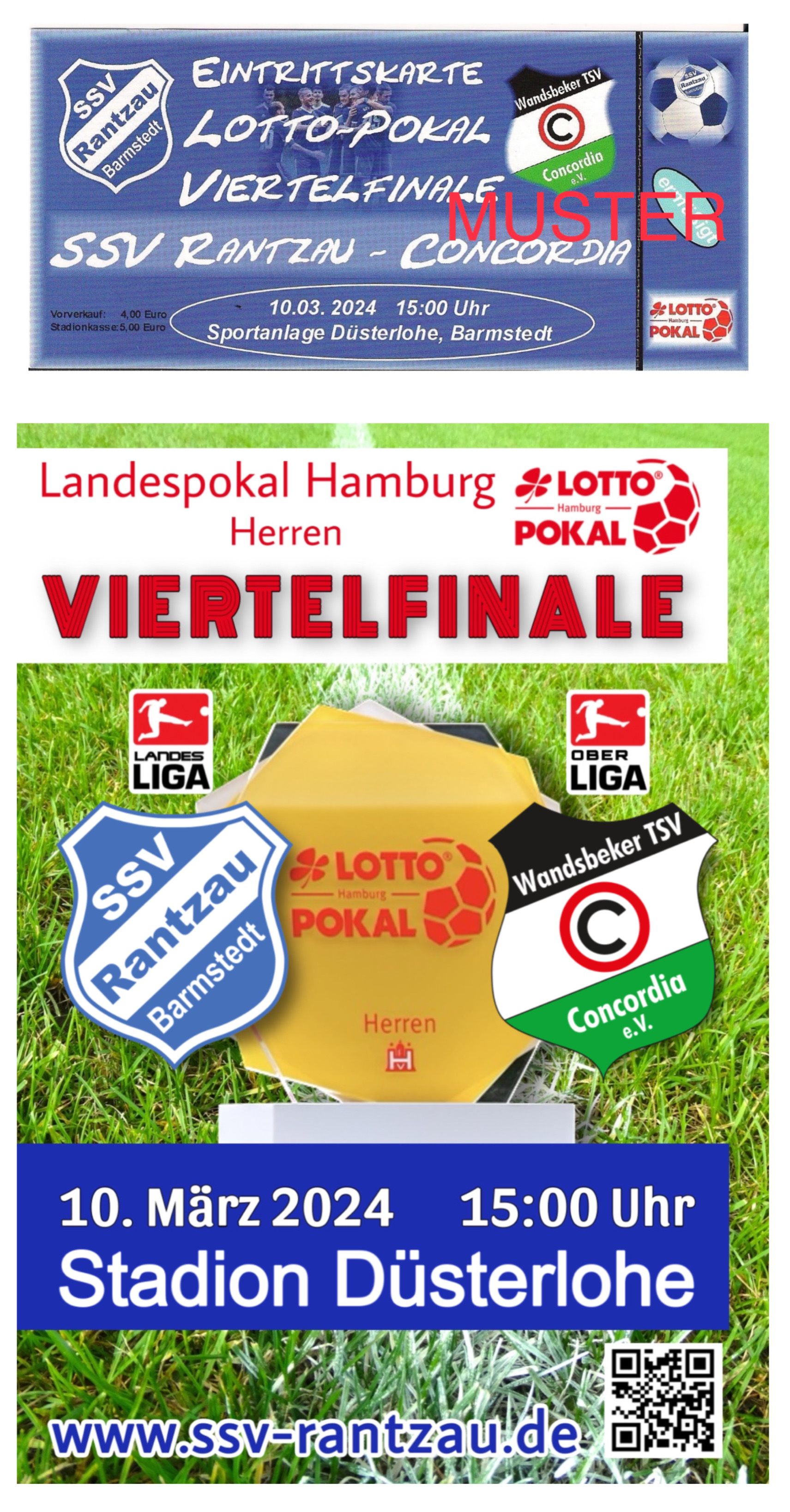 76 Jahre später: Die Eintrittskarte und Ankündigung zum Fußballereignis auf der Düsterlohe: Sonntag, 10. März 2024 15.00 Uhr: Viertelfinal- Lottopokalspiel SSV Rantzau gegen Concordia. Vorverkaufskarten erhältlich im SSV Vereinsheim Düsterlohe, Tabak-Shop Barmstedt, Küsterkamp 1 und online (siehe SSV - Homepage www.ssv-rantzau.de)