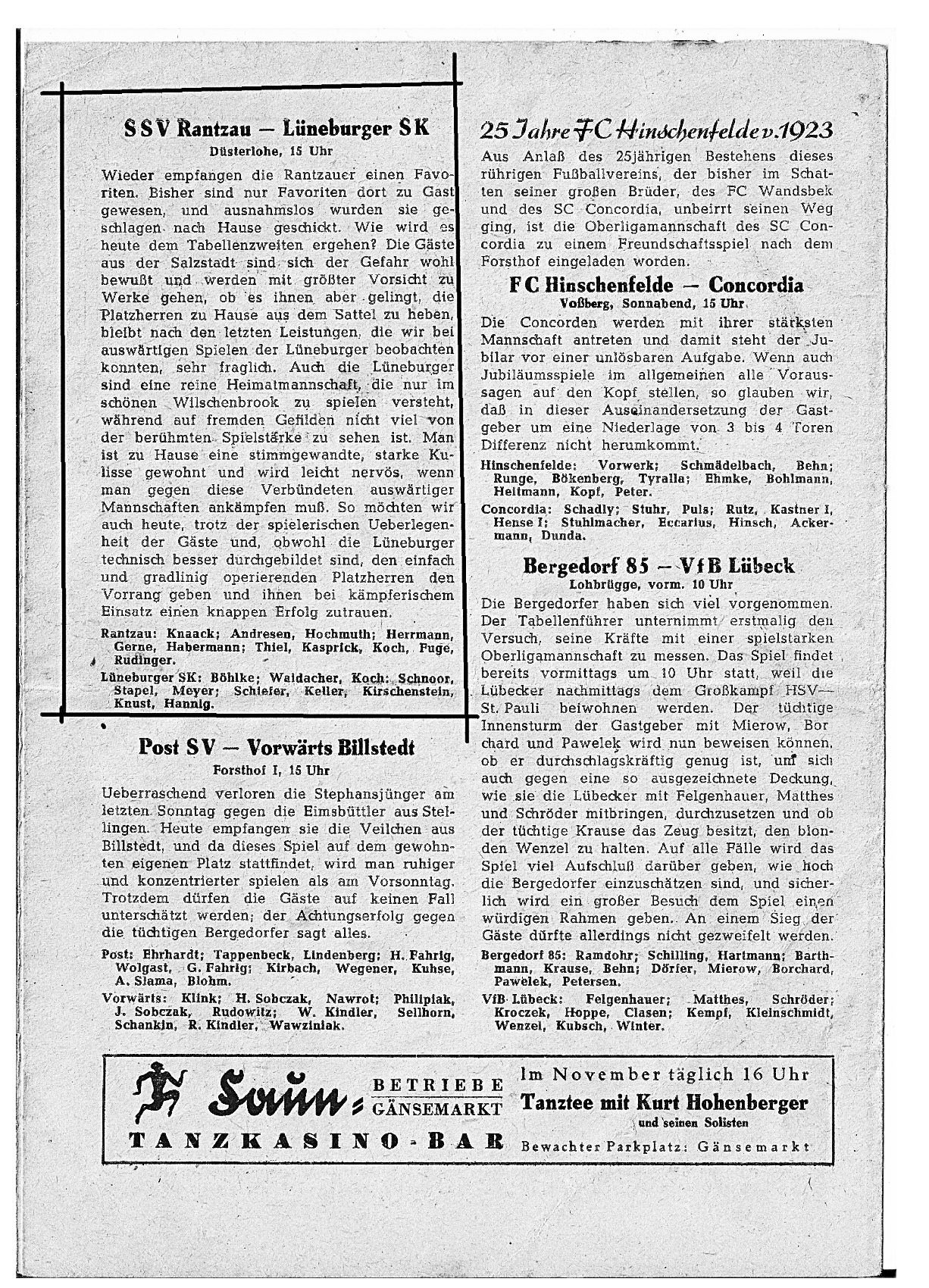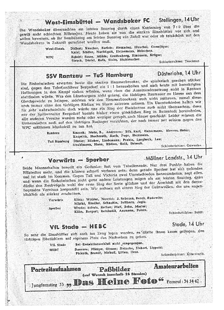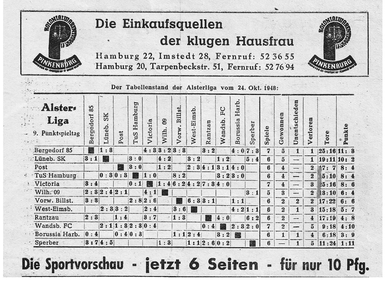 Und so sah der Tabellenstand der Hamburger Alsterliga am 24. Okt. 1948 aus. Der SSV Rantzau hielt sich im unteren Mittelfeld.  Wie man sieht, konnte man die „Sportvorschau“ damals für „nur 10 Pfennig“ erwerben.