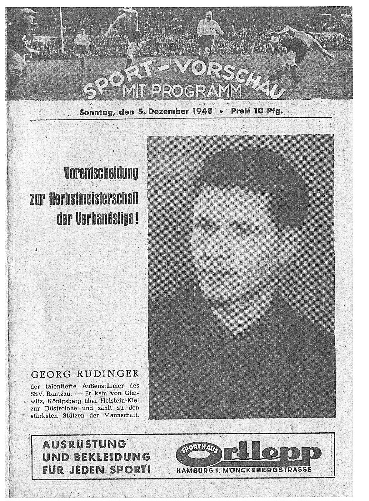 Georg (Schorsch) Rudinger vom SSV Rantzau, der Stürmerstar der Hamburger Verbandsliga. 1945 hatten ihn die Kriegswirren nach Barmstedt verschlagen. Vor dem Krieg spielte er beim VFB Königsberg, VFB Gleiwitz, in der Schlesischen Ländermannschaft und bei Holstein Kiel. 1948 schoss er dann bei Schalke 04 seine Tore und später bei Alemannia Aachen.