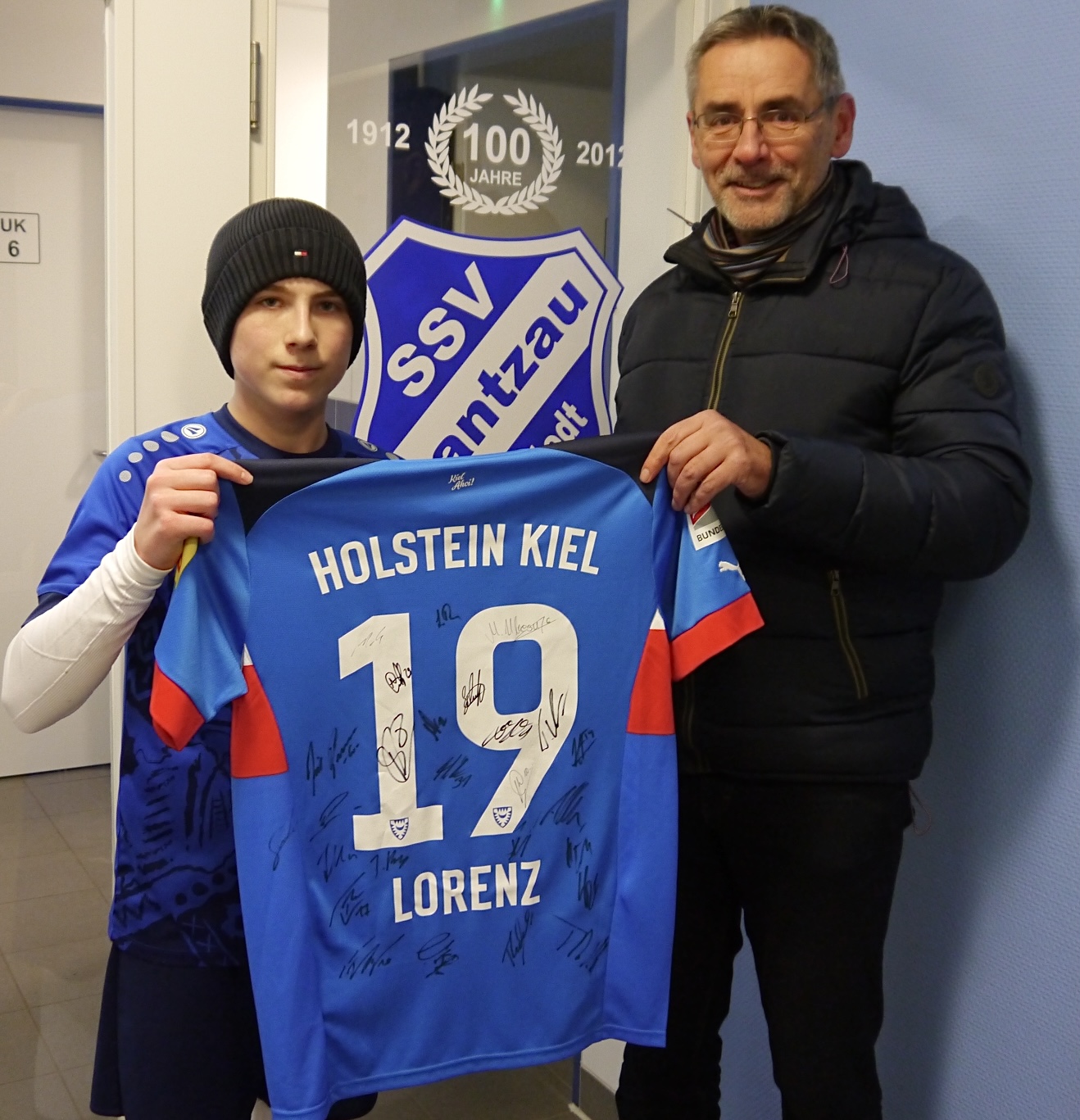 Im Dezember startete der SSV an dieser Stelle die Online-Versteigerung eines original Trikots von Holstein Kiel. Dieses wurde im Rahmen des Jubiläumsspiels im vergangenen Juni auf der Düsterlohe von der kompletten Kieler Mannschaft unterschrieben. Der Gewinner Sönke T. aus Elmshorn, der für 399 Euro das Trikot ersteigerte, ist dabei kein Unbekannter beim SSV. Sein Sohn Jona spielt in der C-Jugend des SSV Rantzau und nahm heute freudestrahlend das Trikot entgegen.  Das Geld wurde, wie angekündigt, an die Organisation  „Wünschewagen Schleswig-Holstein“ (wuenschewagen.de/schleswig-holstein) weitergeleitet. Wir freuen uns, dass wir mit dieser tollen Summe einen Beitrag leisten können, einen letzten Wunsch in Erfüllung gehen zu lassen.