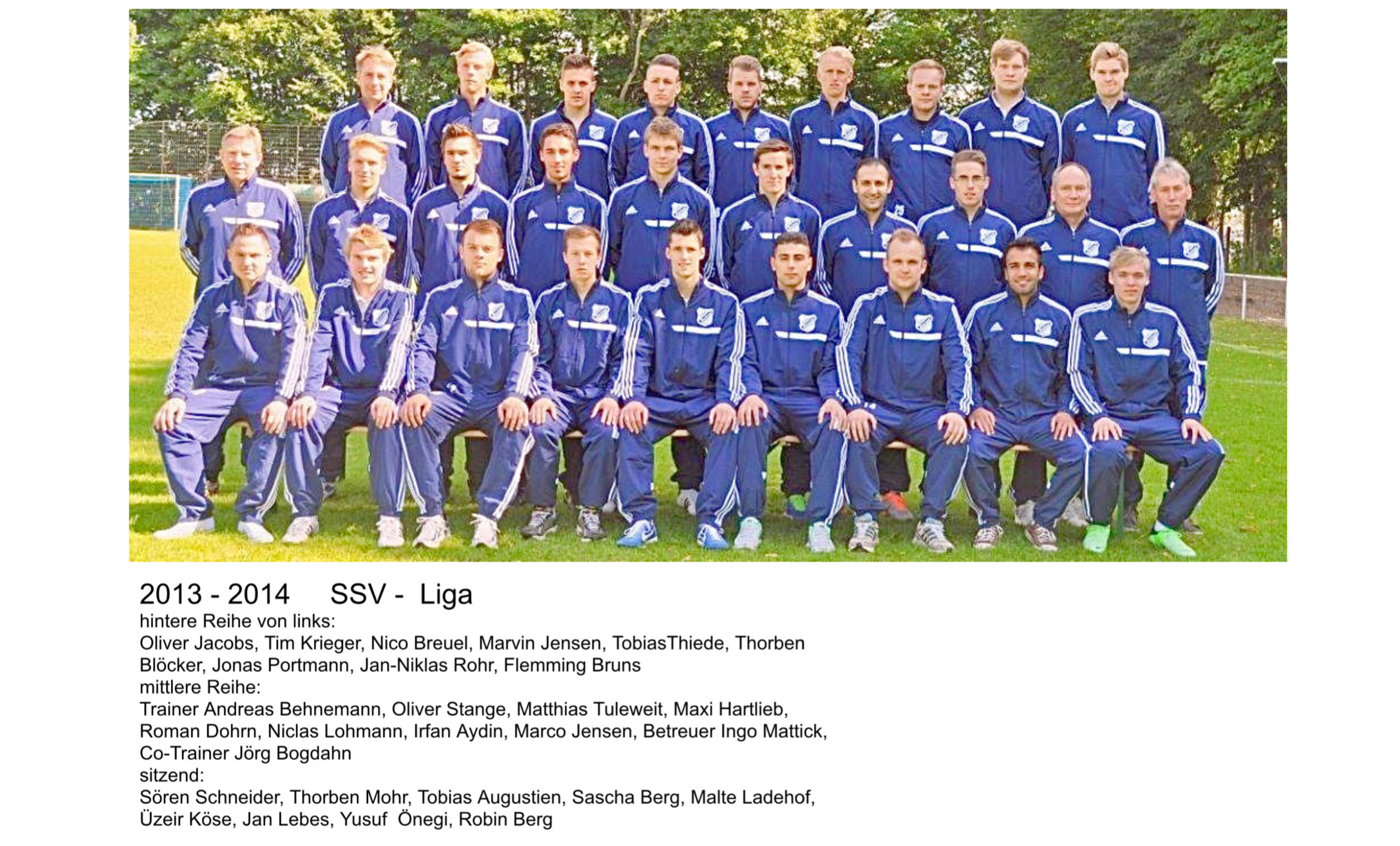 Das SSV-Archiv macht’s möglich: An dieser Stelle werden künftig in loser Reihenfolge Fotos früherer Ligamannschaften erscheinen. Den Anfang macht eine Aufnahme der Ligamannschaft der Spielserie 2013/14. Damals spielte der SSV noch in der Bezirksliga West, bis er 2017/18 in die jetzige Landesliga aufstieg. Und wie man sieht, sind nicht nur wenige der damaligen Spieler auch heute noch im Kader der Liga oder 2. Herren dabei. Andere sind in den Altherrenbereich gewechselt oder haben Trainerfunktion übernommen. Da werden Erinnerungen wach ….