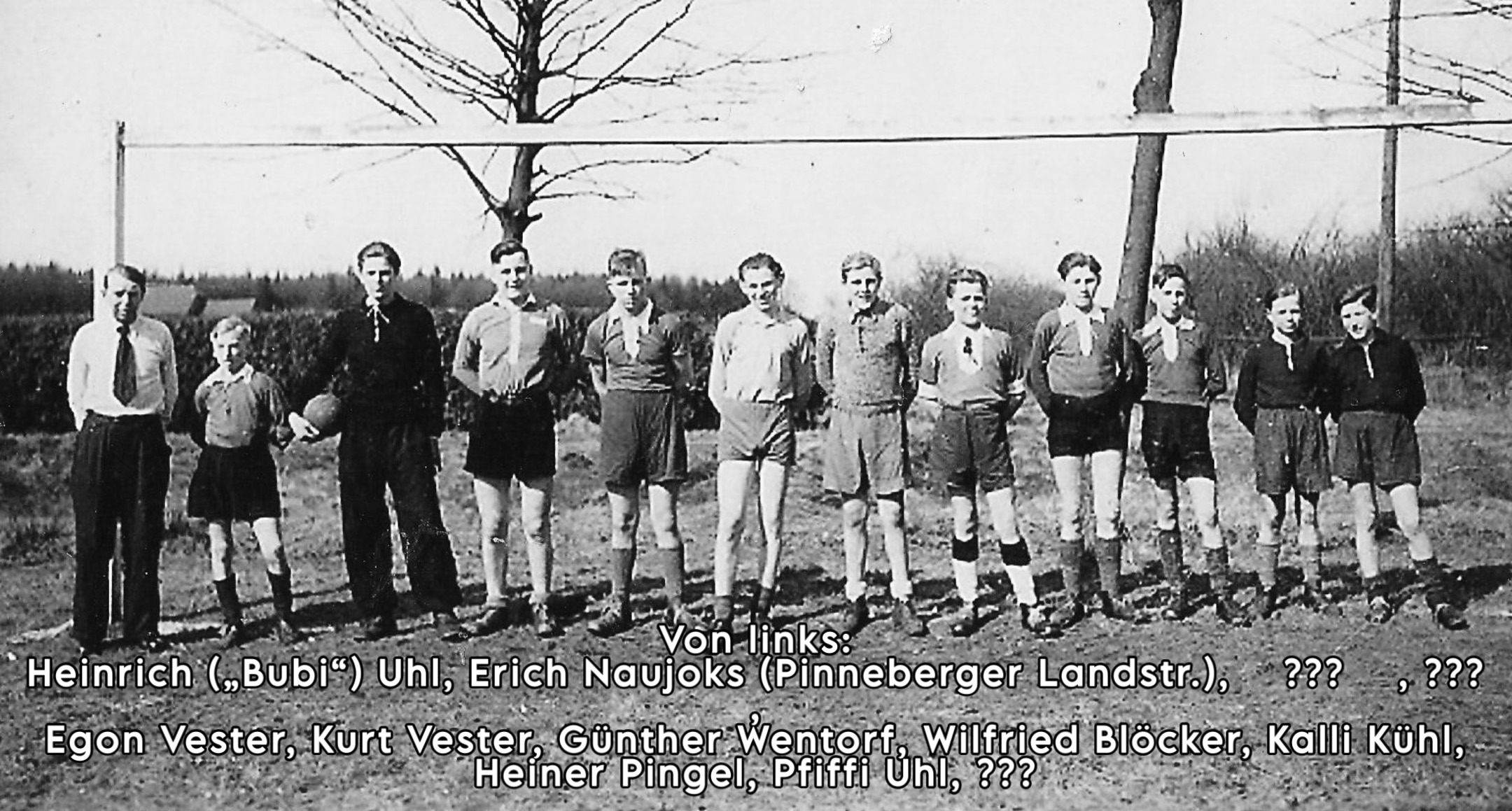 Ein dem SSV-Archiv übergebenes Foto aus dem Jahr 1948 lässt Erinnerungen wach werden. Der 2. Weltkrieg war erst drei Jahre zu Ende. Die SSV-Liga sorgte wegen ihrer Spiele auf der Düsterlohe gegen ehemalige Deutsche Fußballmeister wie z. B.  HSV, Fortuna Düsseldorf und Hannover 96 für Schlagzeilen. Aber auch die SSV-Jungmann, wie sich die Altersklasse damals nannte, war mehr als aktiv. Und die Aufnahme auf der Düsterlohe sorgt für Überraschungen. So entdeckte SSV-Superoldie Siggi Vester nicht nur seinen Vater, sondern auch seinen Onkel in ausgesprochen flotter Trainingskluft auf dem Foto. Doch damit nicht genug, denn auch weitere Barmstedter haben Fußballer aus ihrer Familie auf der Aufnahme entdecken können. Wie schön, dass es das SSV-Archiv gibt…