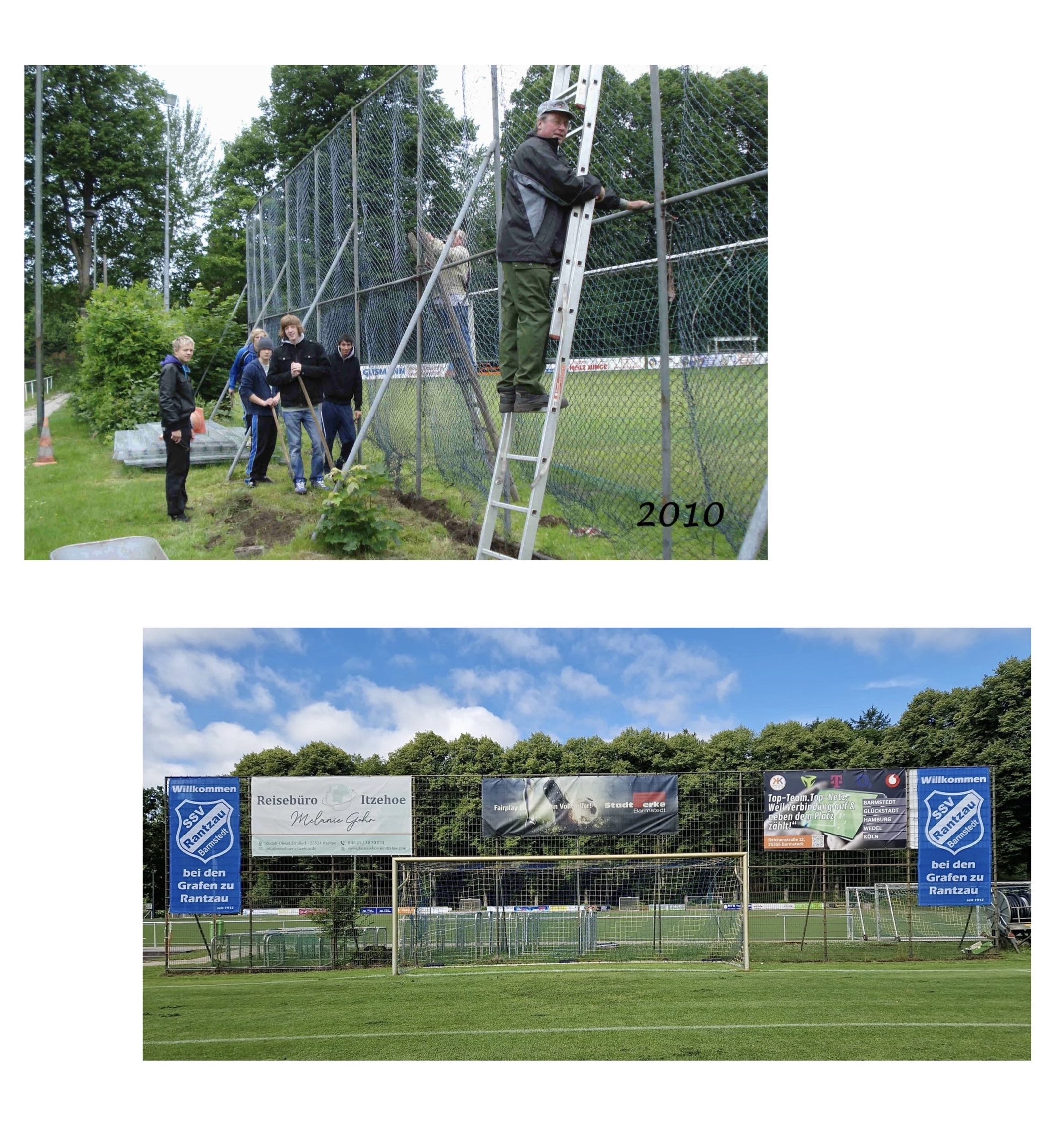 Jahrelang führten die Ballfangzäune hinter den Toren auf Platz D1 optisch ein eher tristes Dasein. Doch dank des rührigen Sponsoring-Teams um Eddy Behnemann ist mit den neuen Werbebannern hinter beiden Toren Farbe eingekehrt. Ergebnis: Die Düsterlohe hat an Attraktivität weiter gewonnen. Das war 2010 beim Bau der Ballfangzäune durch den SSV-Arbeitsdienst mit dem damals wie heute fleißigen Hans-Jürgen Scharlach an der Spitze sicherlich nicht zu erahnen. Mit auf dem Archivfoto mit Manni Grundschok übrigens ein weiterer SSV-Superoldie sowie Aktive der damaligen A-Jugend. Und selbstverständlich wurde nicht vergessen, nahe der Anlage eine „Zeitkapsel“ mit damals aktuellen Tageszeitungen und heute historischen Dokumenten zum Bauvorhaben im Erdreich zu „verbuddeln“. Das war vor nunmehr fünfzehn Jahren …